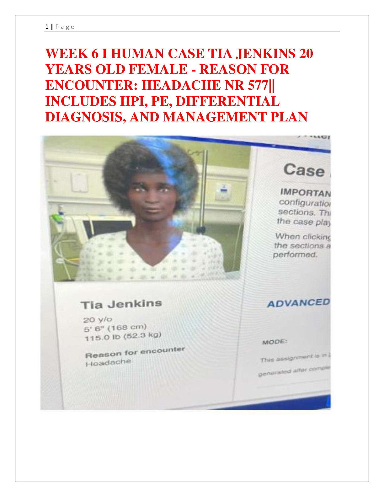 Ace your NR 577 Week 6 assignment with this detailed guide for the i-Human case of Tia Jenkins, a 20-year-old female with a chief complaint of headache. This 2025/2026 updated resource provides a complete and accurate walkthrough, covering all essential components: a thorough History of Present Illness (HPI), key Physical Examination (PE) findings, an expertly crafted Differential Diagnosis, and a step-by-step Management Plan. Download now to understand the case inside-out, save study time, and secure top grades, ensuring you pass your exams on the first attempt without needing resits.