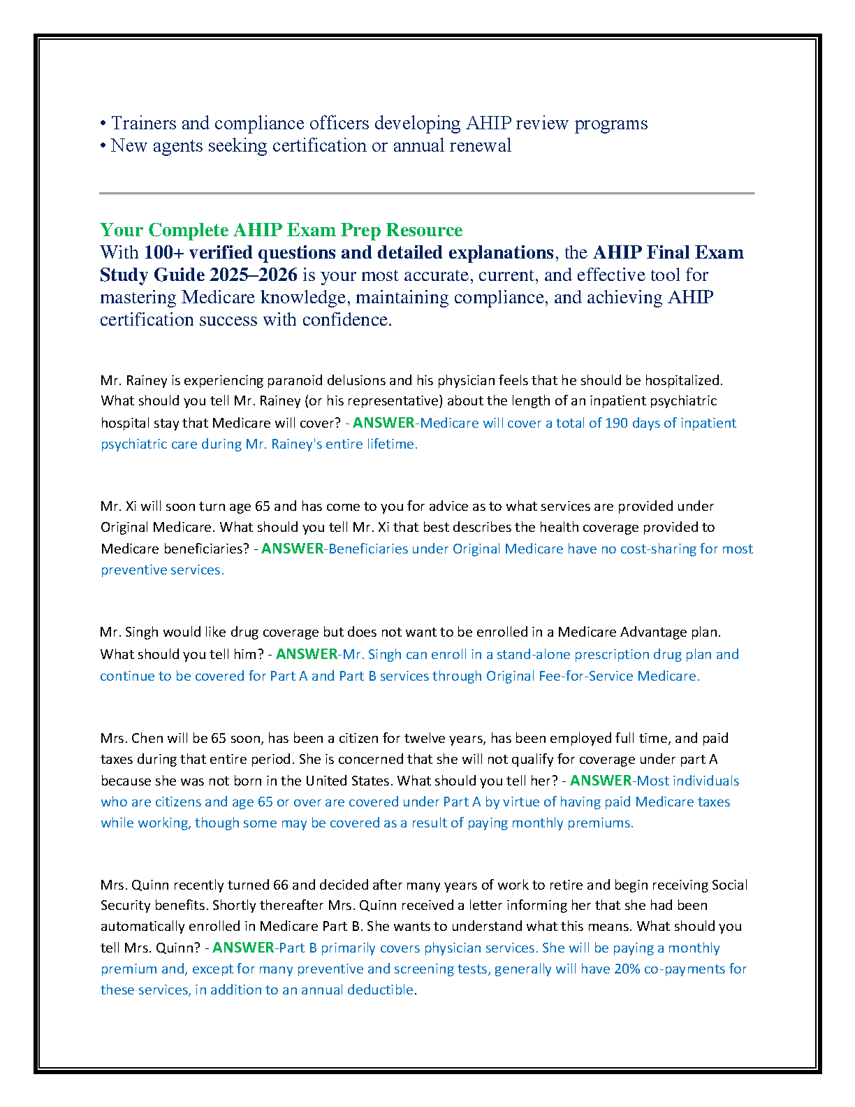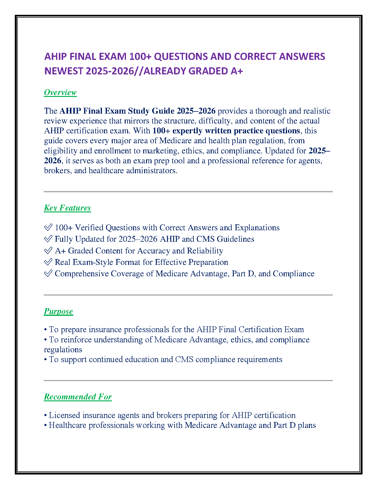 Ace your AHIP certification on the first try with our premier 2025-2026 Final Exam Study Guide. This comprehensive resource is expertly designed to guarantee your success, featuring over 100 meticulously verified questions complete with correct answers and detailed explanations. Our guide is fully updated for the 2025-2026 AHIP and CMS guidelines, ensuring you study the most current material. It provides a realistic exam experience covering all critical topics such as Medicare Advantage, Part D, compliance, marketing, and ethics. Perfect for insurance agents, brokers, and healthcare professionals, this A+ graded material is your ultimate tool to avoid resits and achieve your certification with confidence.