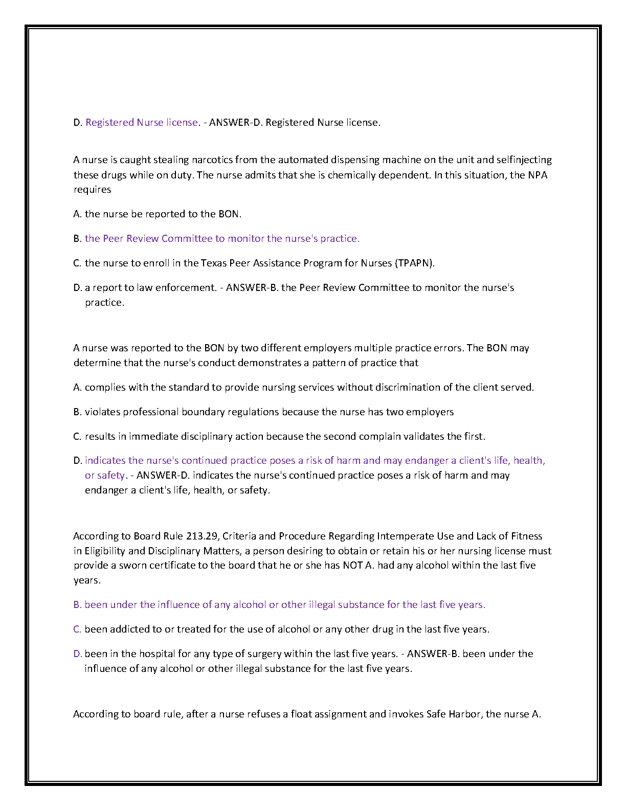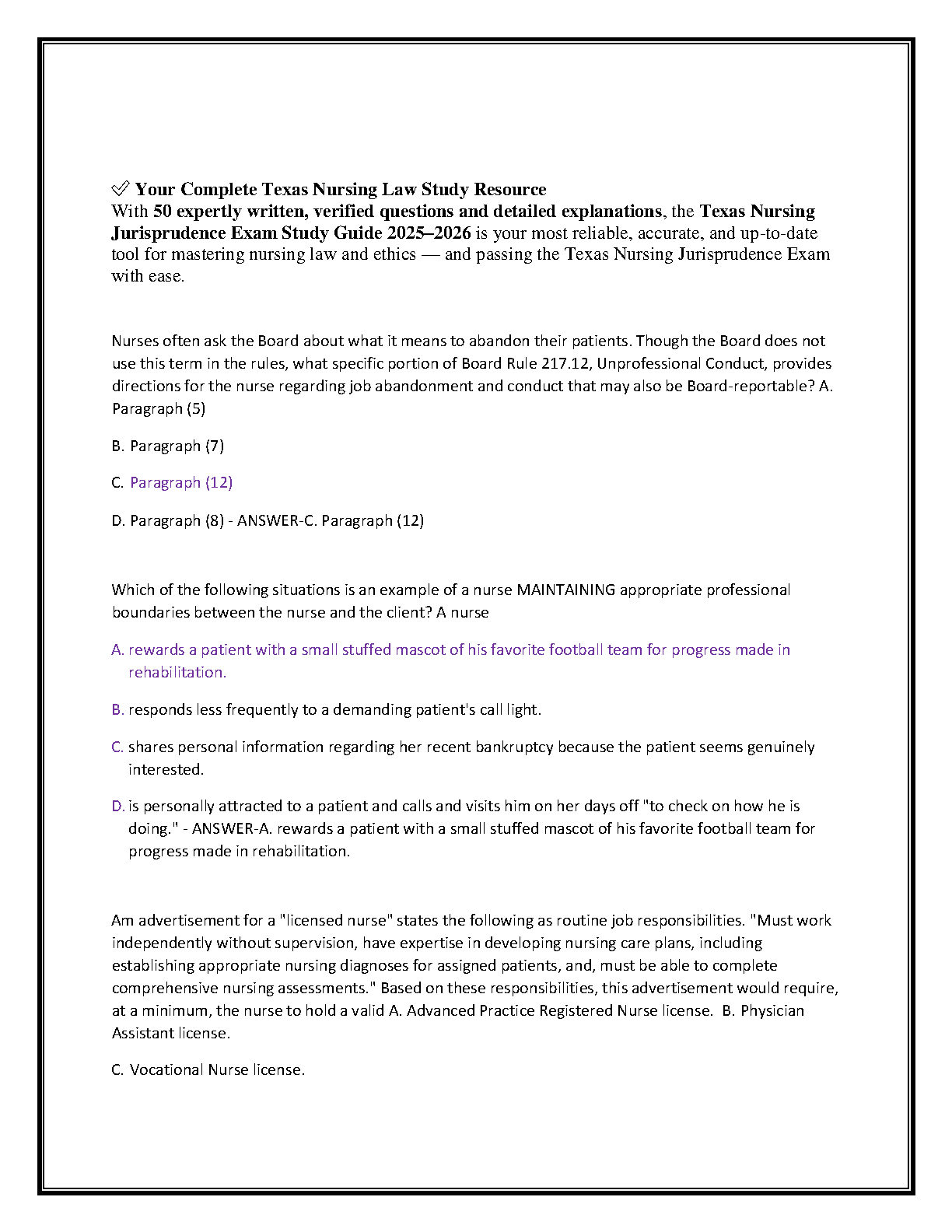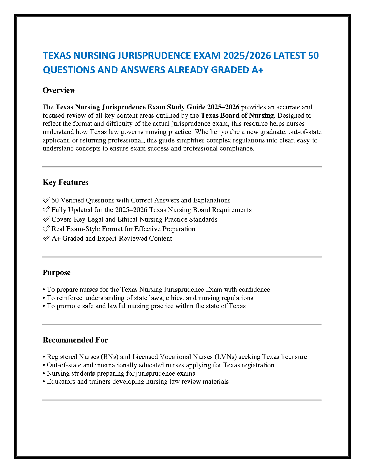 Ace the Texas Nursing Jurisprudence Exam (NJE) on your first try with our comprehensive 2025-2026 test bank. This essential study guide features 50 expertly-verified questions, complete with detailed answers and rationales, all graded A+. Designed to mirror the actual exam format and aligned with the latest Texas Board of Nursing requirements, this resource simplifies complex legal and ethical standards. Whether you're a new graduate, an out-of-state nurse seeking licensure, or an LVN, this guide provides the focused preparation you need to pass with confidence and ensure professional compliance.