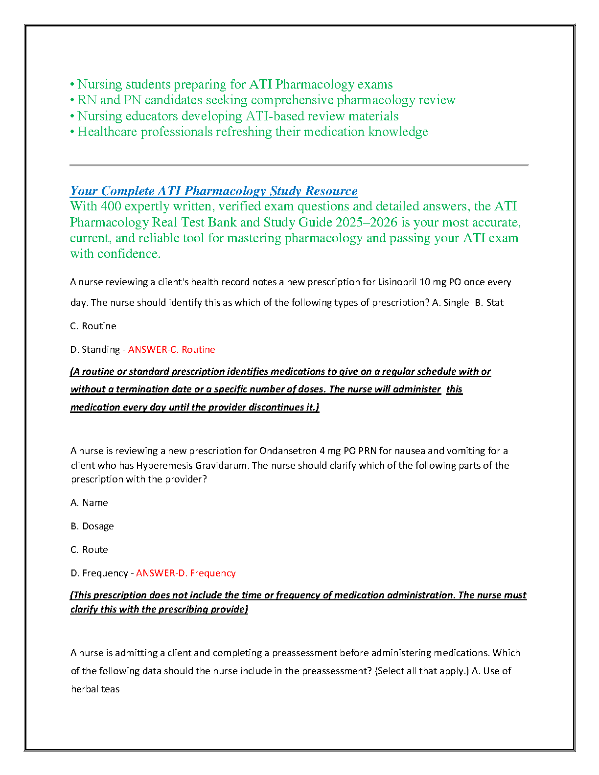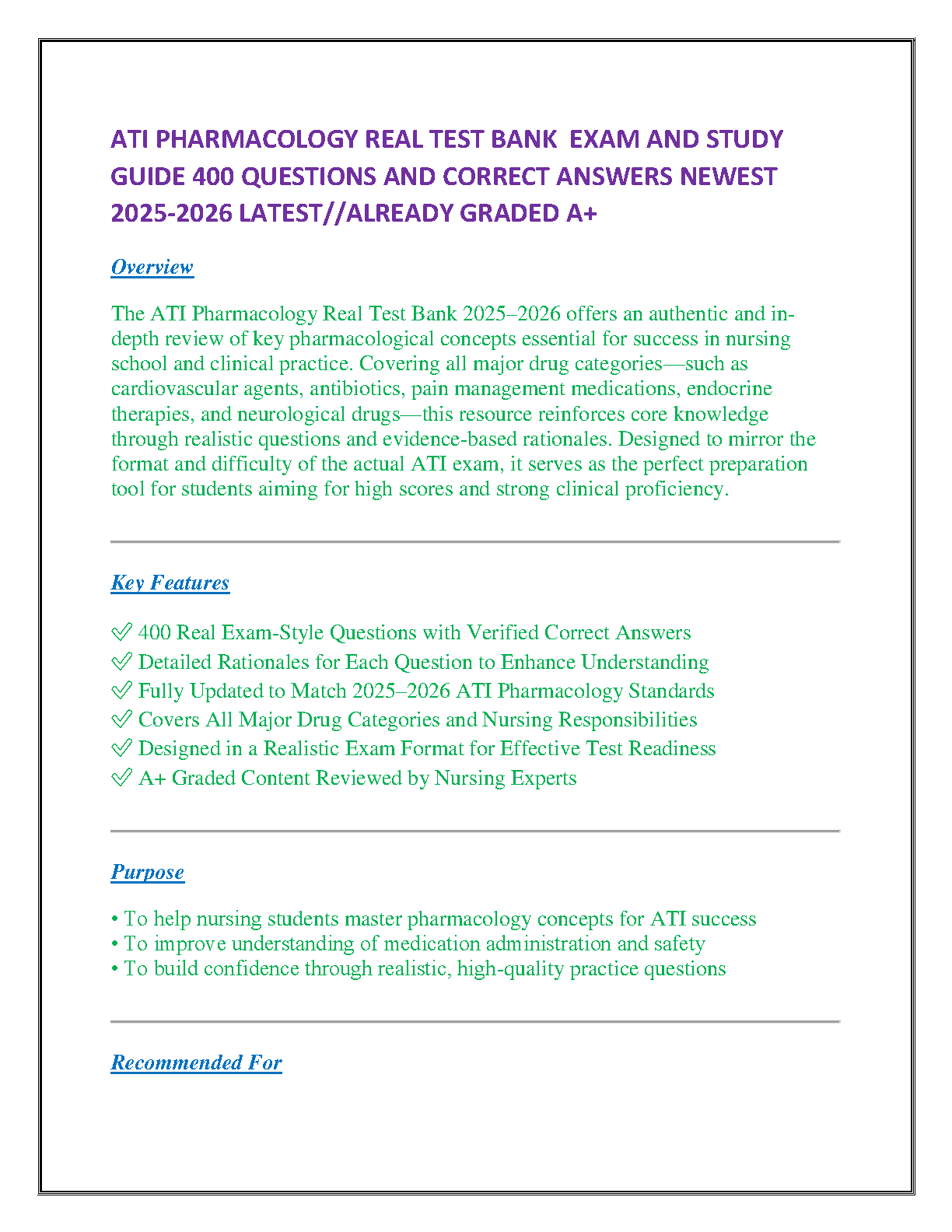 Achieve top scores on your nursing exams with the ATI Pharmacology Real Test Bank for the 2025-2026 academic year. This comprehensive study guide features over 400 realistic, exam-style questions complete with verified correct answers and detailed, evidence-based rationales. Designed to mirror the actual ATI exam format, this resource covers all essential drug categories—from cardiovascular agents to neurological drugs—ensuring you master the key concepts needed for success in nursing school and clinical practice. Our A+ graded content, reviewed by nursing experts, is the ultimate tool to build confidence and pass your pharmacology exam on the first attempt.