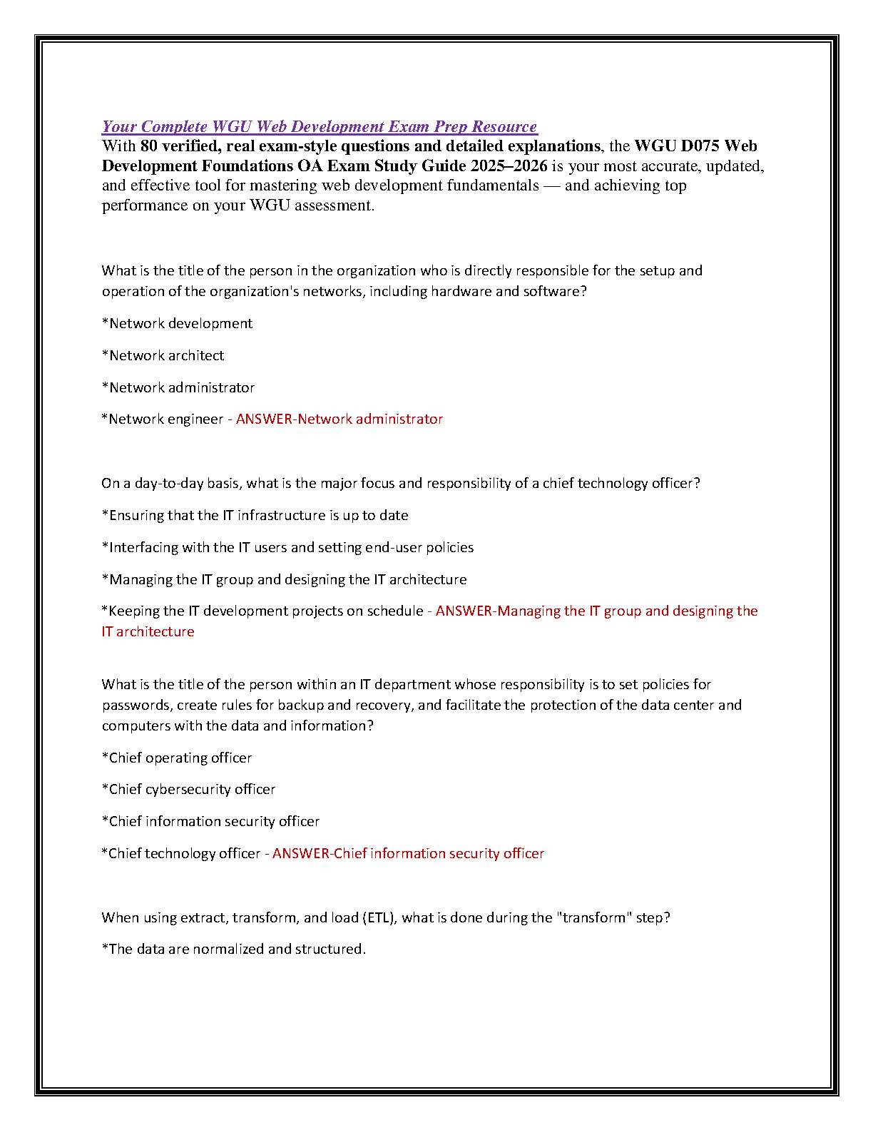 Ace your WGU D075 Web Development Foundations final exam with our comprehensive 2025-2026 Test Bank. This essential study guide features 80 A+ graded, exam-style questions complete with correct, detailed answers. Expert-reviewed for accuracy, this resource covers all key topics, including HTML, CSS, JavaScript, front-end coding, and web design fundamentals. Designed to mirror the actual D075 Objective Assessment, this test bank simplifies complex concepts and provides the practice you need to master the material and pass with confidence.