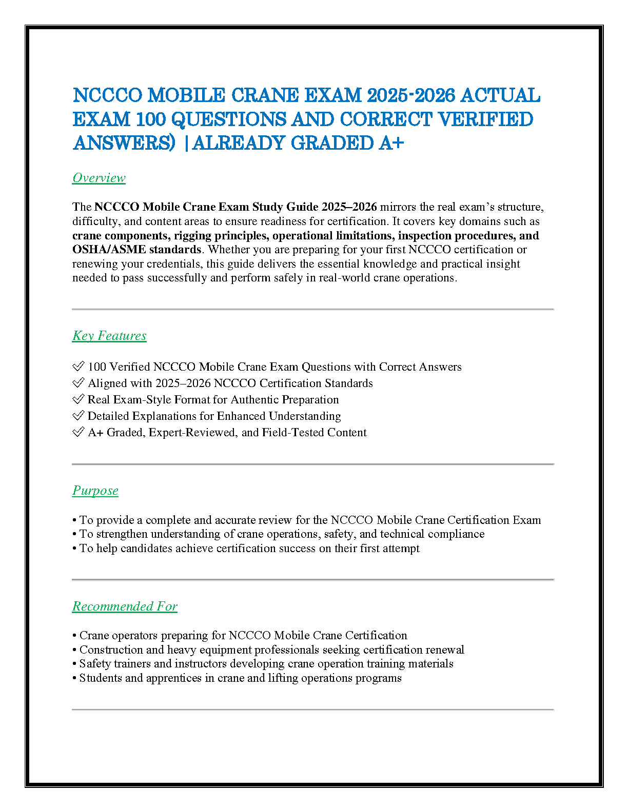 Ace your NCCCO Mobile Crane Operator certification on the first try with our comprehensive 2025-2026 exam study guide. This A+ graded resource is meticulously designed to mirror the actual test, providing you with 100 verified questions and correct, detailed answers. Master crucial topics including crane components, rigging principles, operational limits, inspection protocols, and OSHA/ASME safety standards. This guide is your ultimate tool for success, whether you're a first-time candidate or a professional renewing your certification. Gain the confidence and in-depth knowledge required to not only pass your exam but also excel in safe, real-world crane operations.