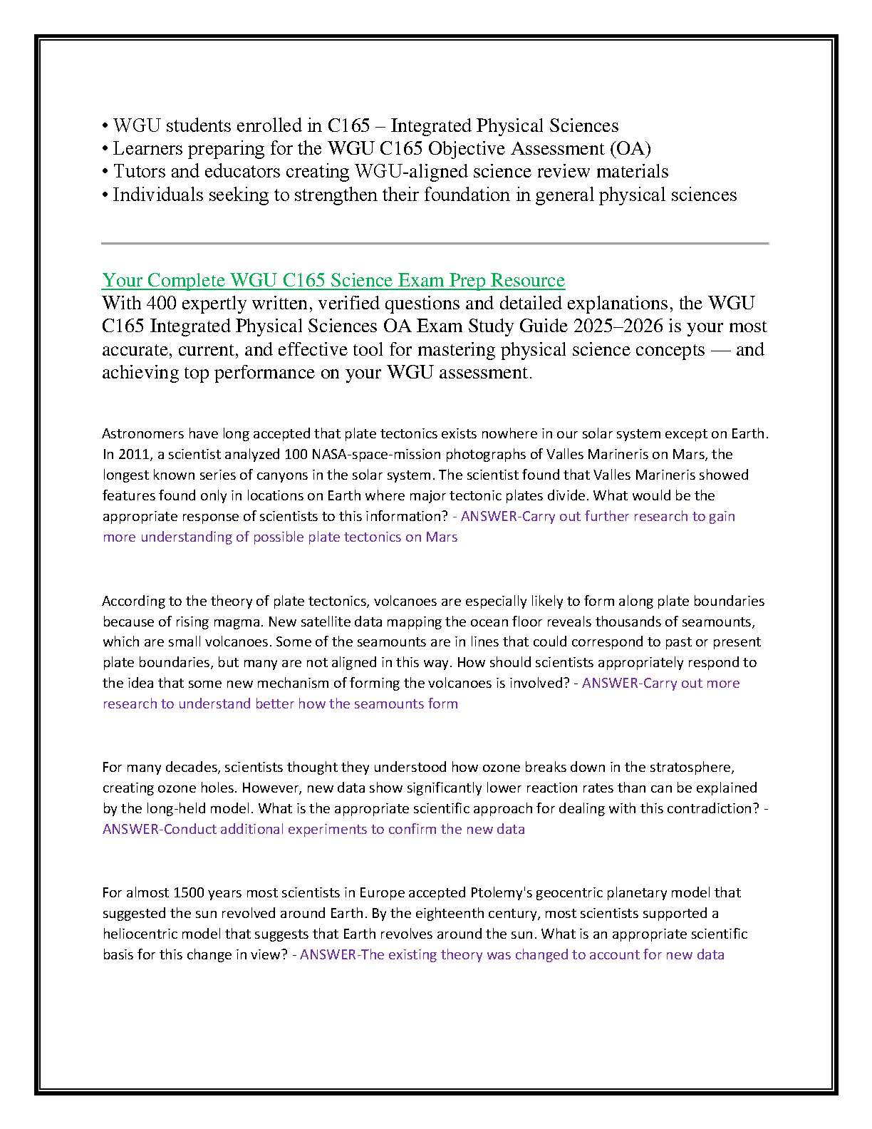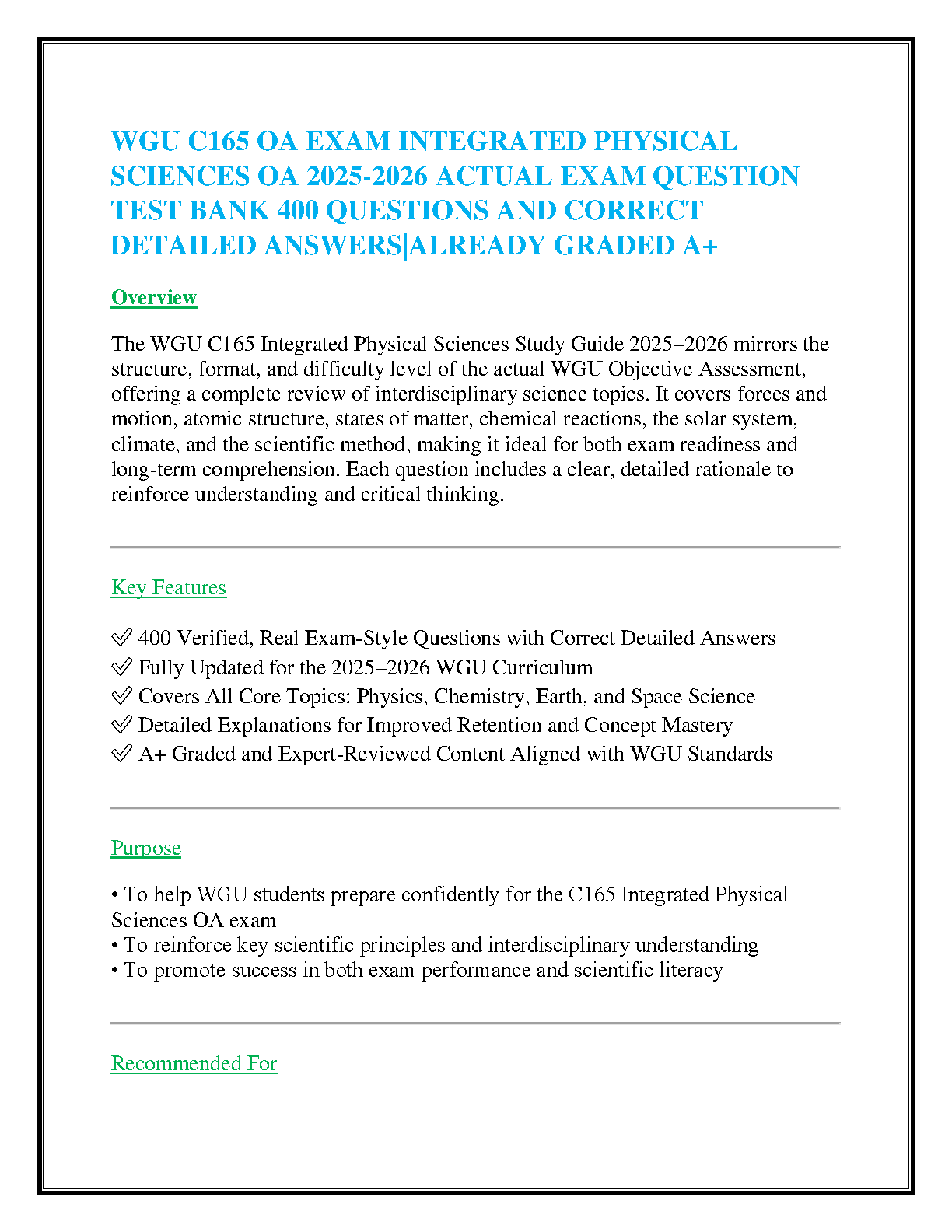 Master the WGU C165 Integrated Physical Sciences Objective Assessment with this comprehensive test bank, fully updated for the 2025-2026 academic year. This A+ graded resource features 400 verified, exam-style questions complete with detailed answers and rationales. It is designed to mirror the actual OA's structure and difficulty, covering all essential topics including physics, chemistry, earth science, and space science. Boost your confidence and achieve exam success by practicing with questions on forces, motion, atomic structures, chemical reactions, the solar system, and more. Prepare effectively, deepen your understanding, and pass your C165 exam on the first try.