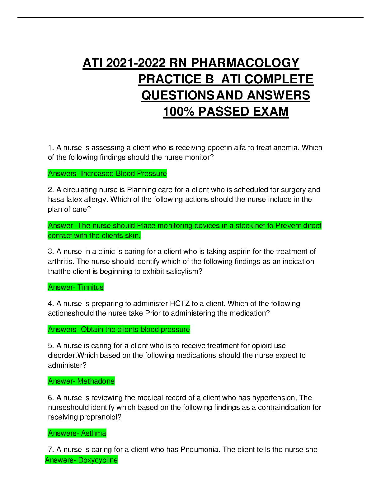 ATI RN Pharmacology Practice B Test Bank (2021-2022 Edition) with Verified Questions and Answers | Updated for 2025/2026 Exam Success