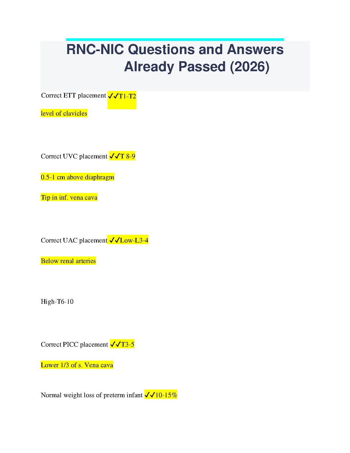 Prepare to ace your Neonatal Intensive Care Nursing certification with our premium RNC-NIC Test Bank, fully updated for the 2025-2026 academic year. This comprehensive resource is packed with verified questions and answers that have been proven to help students pass. Our guide covers essential, high-yield topics you'll encounter on the exam, including correct placement of ETT, UVC, UAC, and PICC lines, and key physiological data like normal weight loss in preterm infants. This test bank is your ultimate tool to pass the RNC-NIC exam on the first try and advance your nursing career.