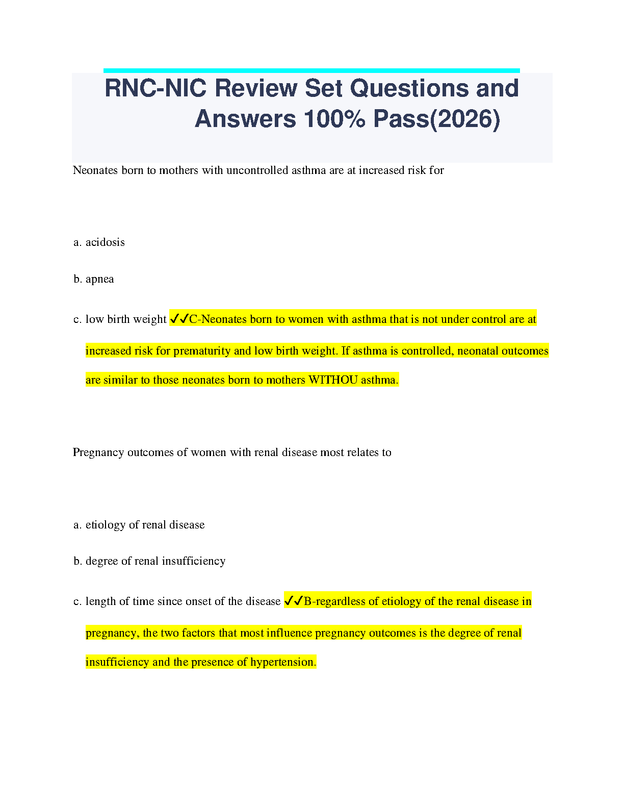 Ace your Neonatal Intensive Care Nursing (RNC-NIC) certification exam with our meticulously compiled 2025/2026 test bank. This essential study resource features an extensive collection of practice questions that mirror the actual exam format, complete with detailed, verified answers and rationales. Covering critical topics such as neonatal risk factors, maternal health impacts, and intensive care protocols, this guide is designed to deepen your understanding and boost your confidence. Stop worrying about resits—prepare effectively and pass on your first attempt. Download now and take the first step towards your RNC-NIC certification!