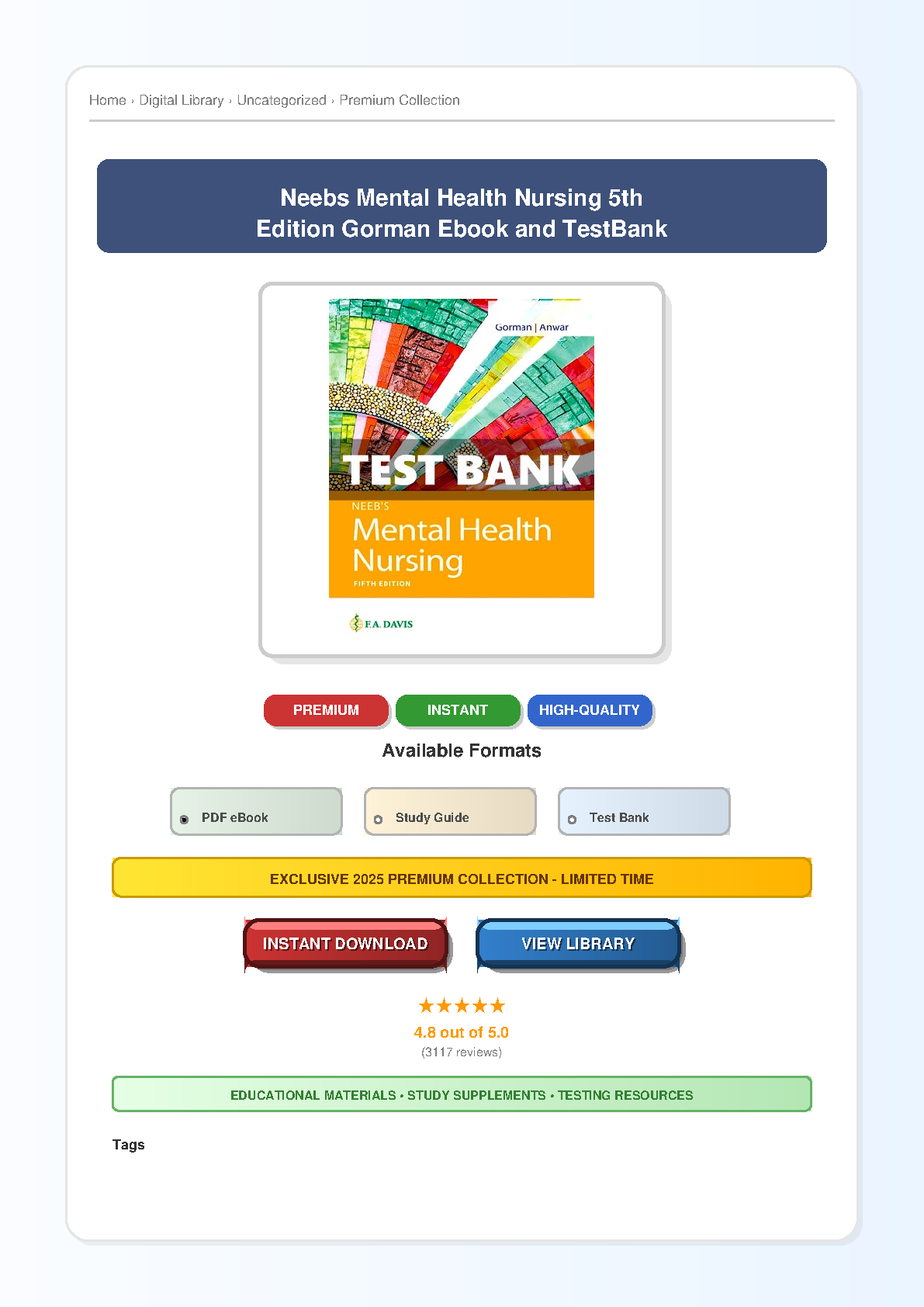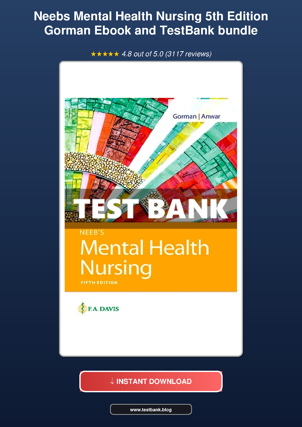 Unlock your full potential with the official Test Bank for the 5th Edition of Neeb's Mental Health Nursing by Gorman and Anwar. This comprehensive resource is designed to help you master complex topics and prepare effectively for your exams. Featuring a wide array of chapter-specific questions, including multiple-choice, fill-in-the-blank, and critical thinking scenarios, this test bank is your key to understanding the core concepts of mental health nursing. Get instant access to the materials you need to study smarter, boost your confidence, and achieve top grades in your course.