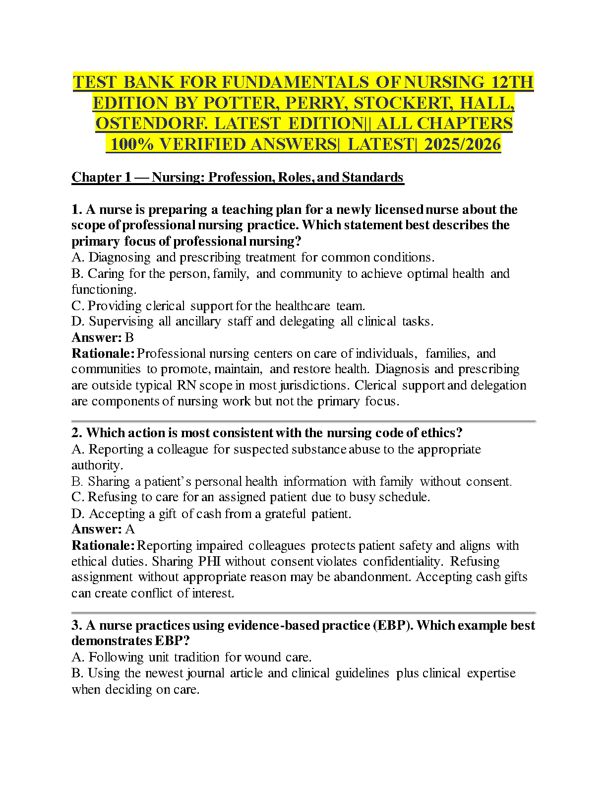 Excel in your nursing course with the complete Test Bank for 'Fundamentals of Nursing, 12th Edition' by Potter, Perry, Stockert, Hall, and Ostendorf. This essential study resource, fully updated for the 2025/2026 academic year, contains hundreds of practice questions covering all chapters. Each question comes with a 100% verified answer and a detailed rationale to deepen your understanding. This is the ultimate tool to help you master key concepts, prepare effectively for exams, and pass on your first attempt, ensuring you avoid costly resits.