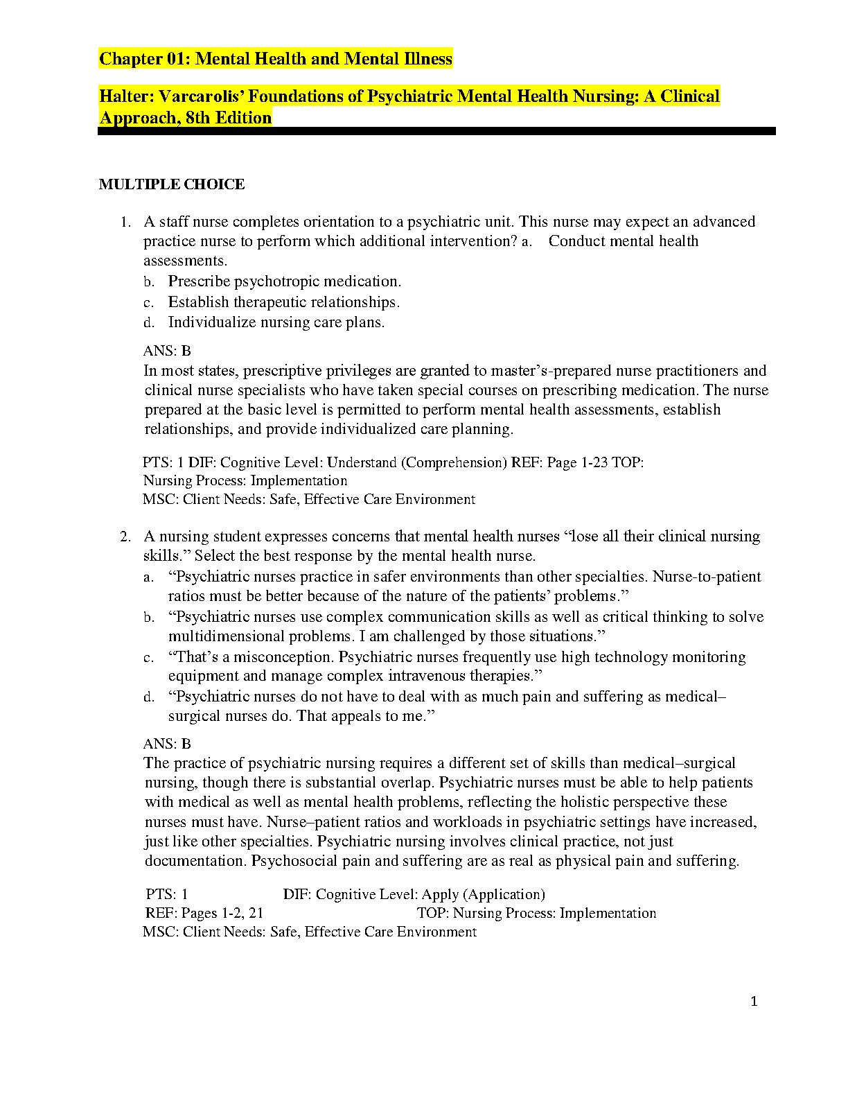 Master your psychiatric mental health nursing course with the official Test Bank for the 8th Edition of Halter's Varcarolis’ Foundations of Psychiatric Mental Health Nursing. This essential study guide provides a comprehensive collection of exam-style multiple-choice questions, complete with verified answers and in-depth rationales for every chapter. It's the ultimate tool designed to help you test your knowledge, understand key concepts, and excel in your nursing exams with confidence.