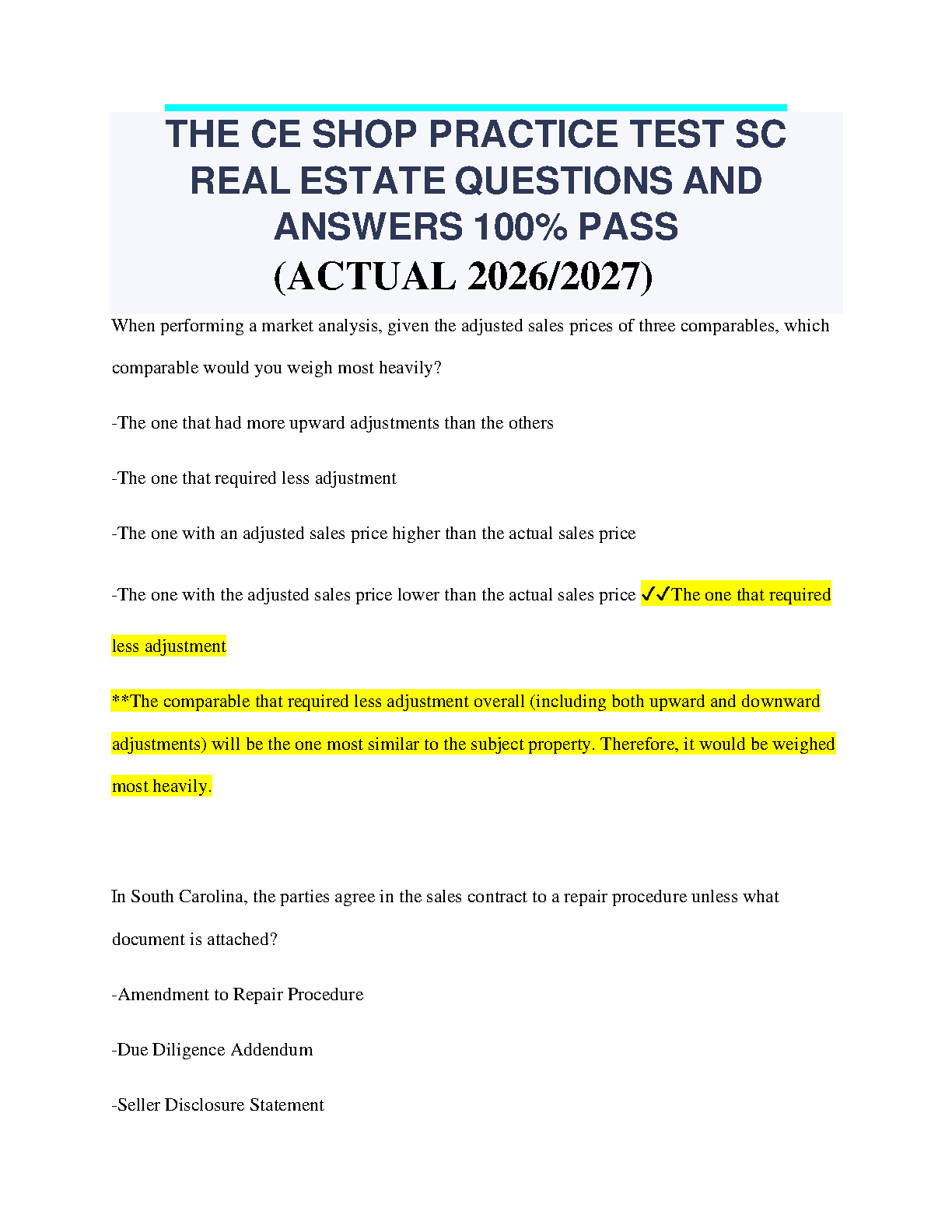 Unlock your real estate career in South Carolina with the ultimate study tool! This is the latest 2025/2026 Test Bank for The CE Shop's SC Real Estate exam, meticulously compiled to guarantee your success. Inside, you'll find a vast collection of practice questions that mirror the actual exam format, complete with detailed, 100% correct answers and clear explanations. Our guide is expertly designed to help you master complex topics like market analysis and state-specific contracts, ensuring you walk into the test with complete confidence. Pass on your very first try, save valuable time, and avoid the stress and cost of resits. Get the edge you need to become a licensed real-estate professional today!