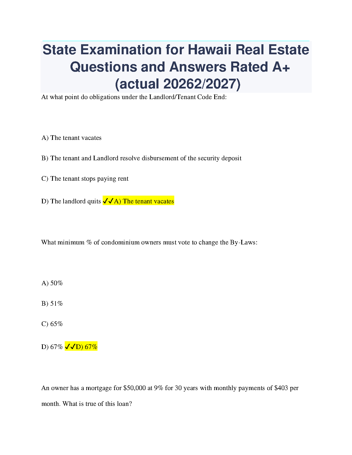 Ace your Hawaii Real Estate State Examination with our latest 2025/2026 test bank! This comprehensive resource is packed with A+ graded questions and detailed, verified answers that mirror the actual exam. Designed to help you master key concepts in Hawaii real estate law, contracts, and practices, this study guide is your key to passing on the first attempt and launching your real estate career with confidence. Avoid resits and study smarter with our proven exam prep materials.