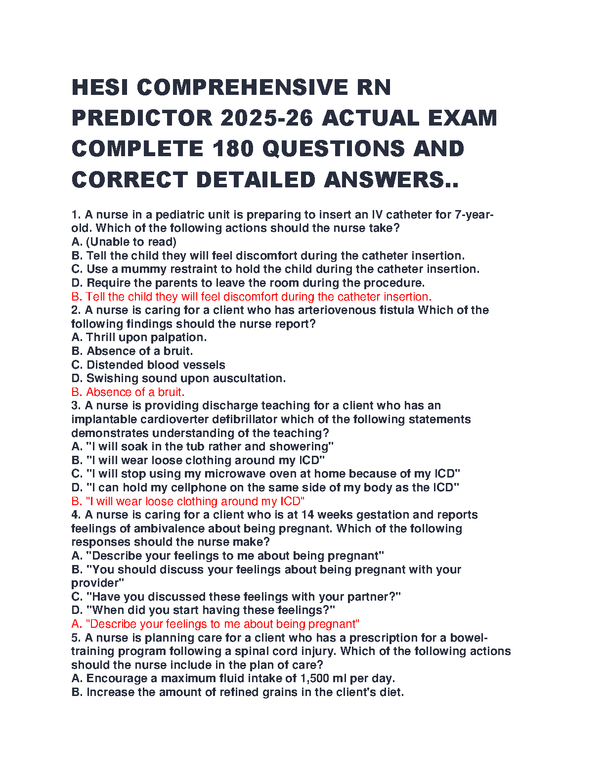 Ace your nursing finals with the ultimate study guide for the HESI Comprehensive RN Predictor Exam, fully updated for the 2025-2026 academic year. This comprehensive test bank features 180 meticulously selected questions that mirror the actual exam format and content. Each question comes with a correct, detailed answer to deepen your understanding and ensure you're fully prepared. Ideal for nursing students aiming to pass their HESI exam on the first try and build a strong foundation for the NCLEX. Download now and take the final step towards becoming a Registered Nurse with confidence!
