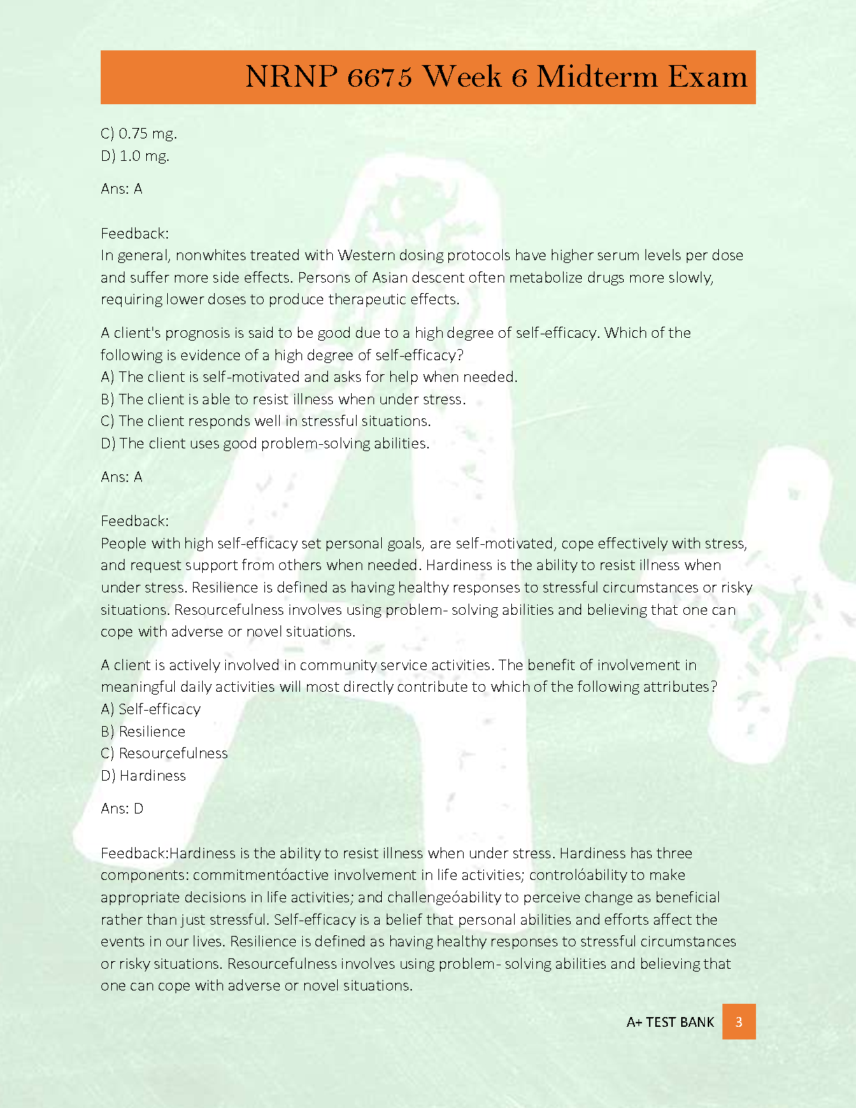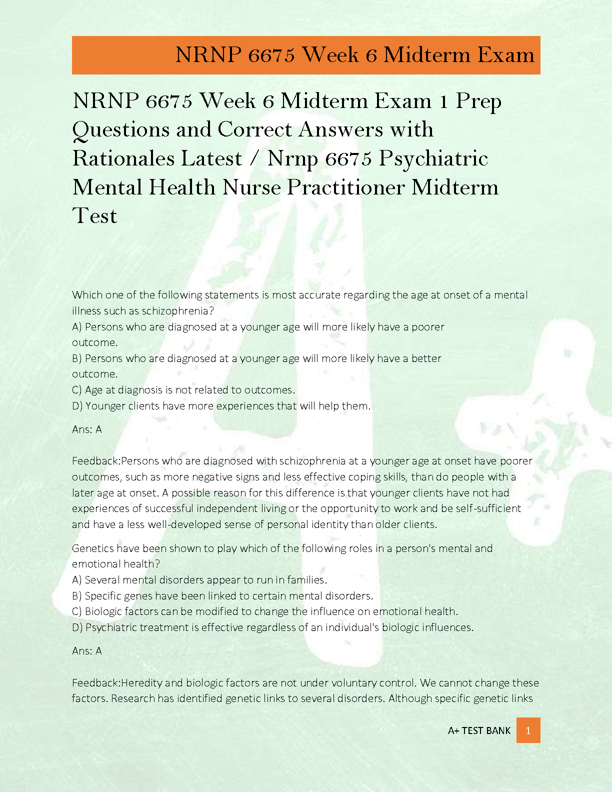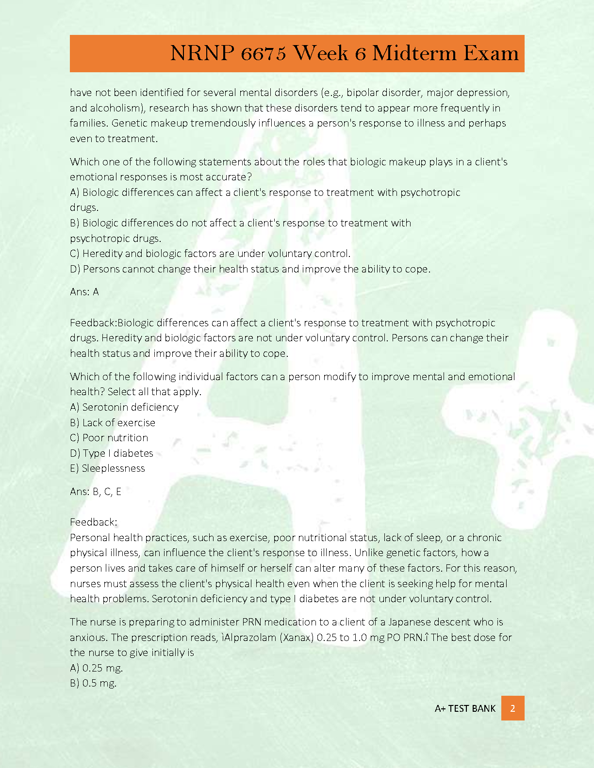 Master the material for your NRNP 6675 Week 6 Midterm Exam with this comprehensive test bank. Designed for Psychiatric Mental Health Nurse Practitioner (PMHNP) students, this guide features a complete set of exam prep questions, 100% correct answers, and thorough rationales. Each rationale provides a detailed explanation, helping you not just to memorize the answers but to truly understand the core concepts. This is the ultimate study tool to boost your confidence, deepen your knowledge, and achieve an A+ grade on your midterm.