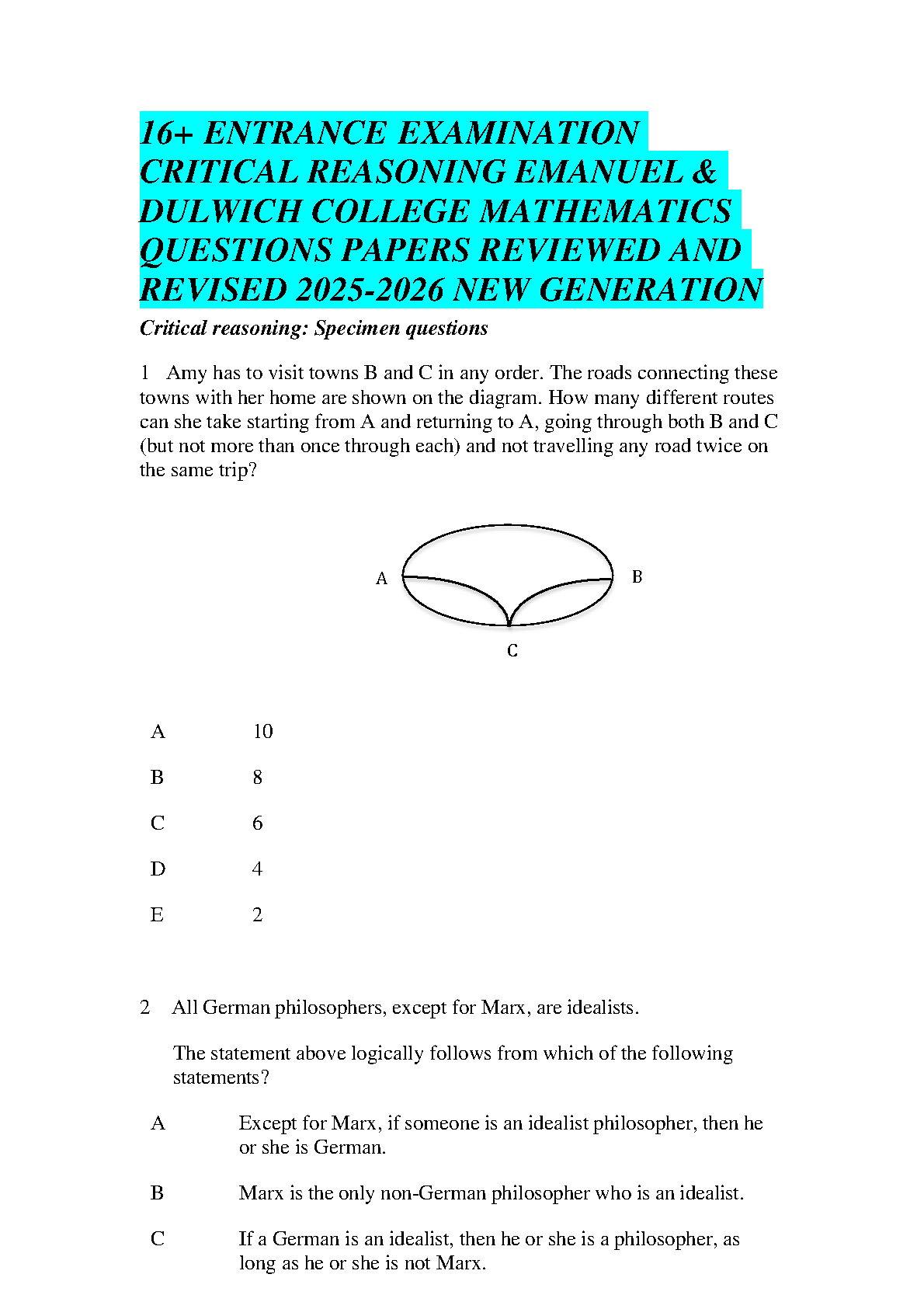 Get fully prepared for the competitive 16+ entrance examinations for Emanuel School and Dulwich College with our revised 2025-2026 question papers. This comprehensive resource covers key topics in Critical Reasoning and Mathematics, featuring specimen questions designed to mirror the actual exam format. Ace your exams on the first attempt by practicing with these latest, new-generation materials. Avoid the stress of resits and secure your spot at a top college.