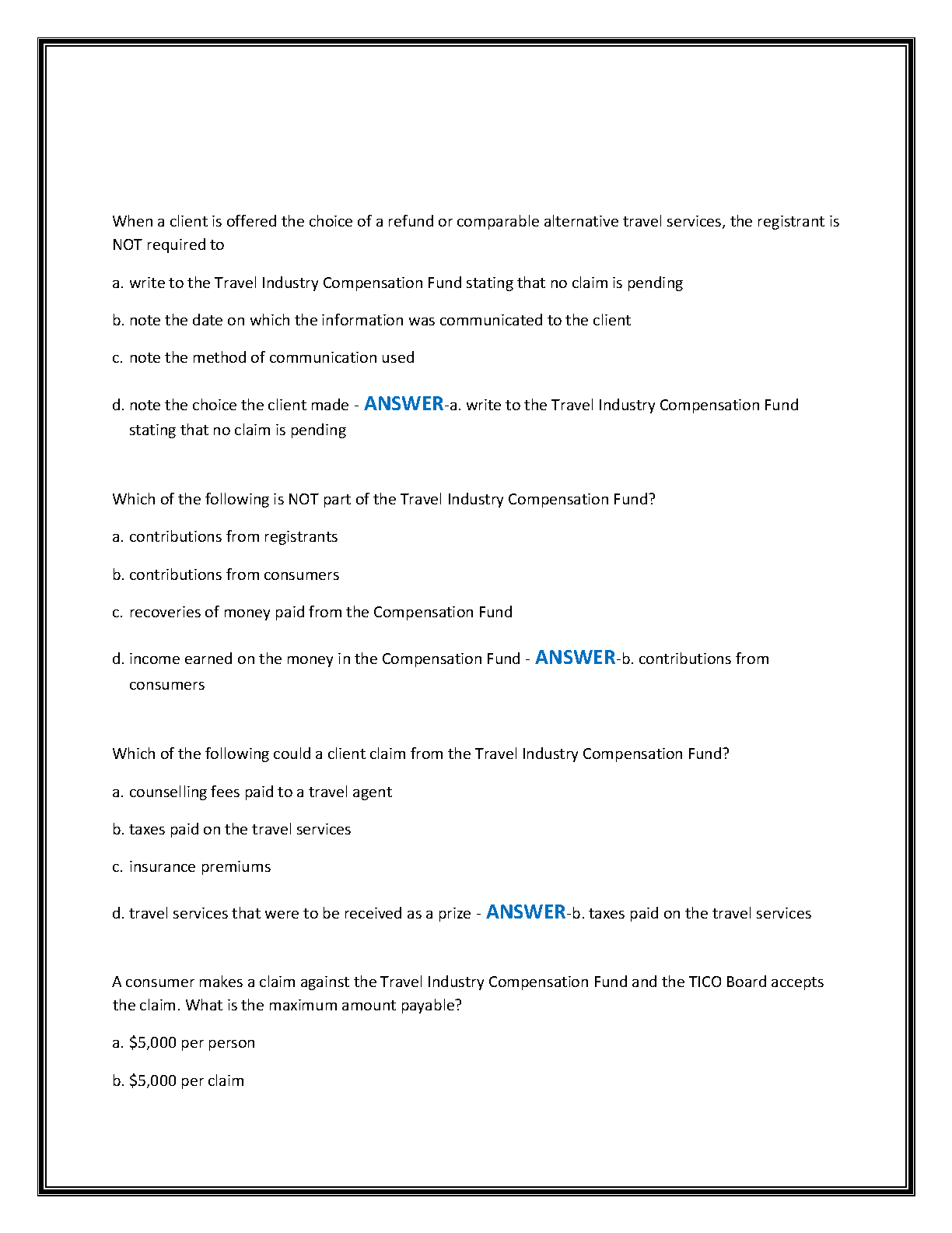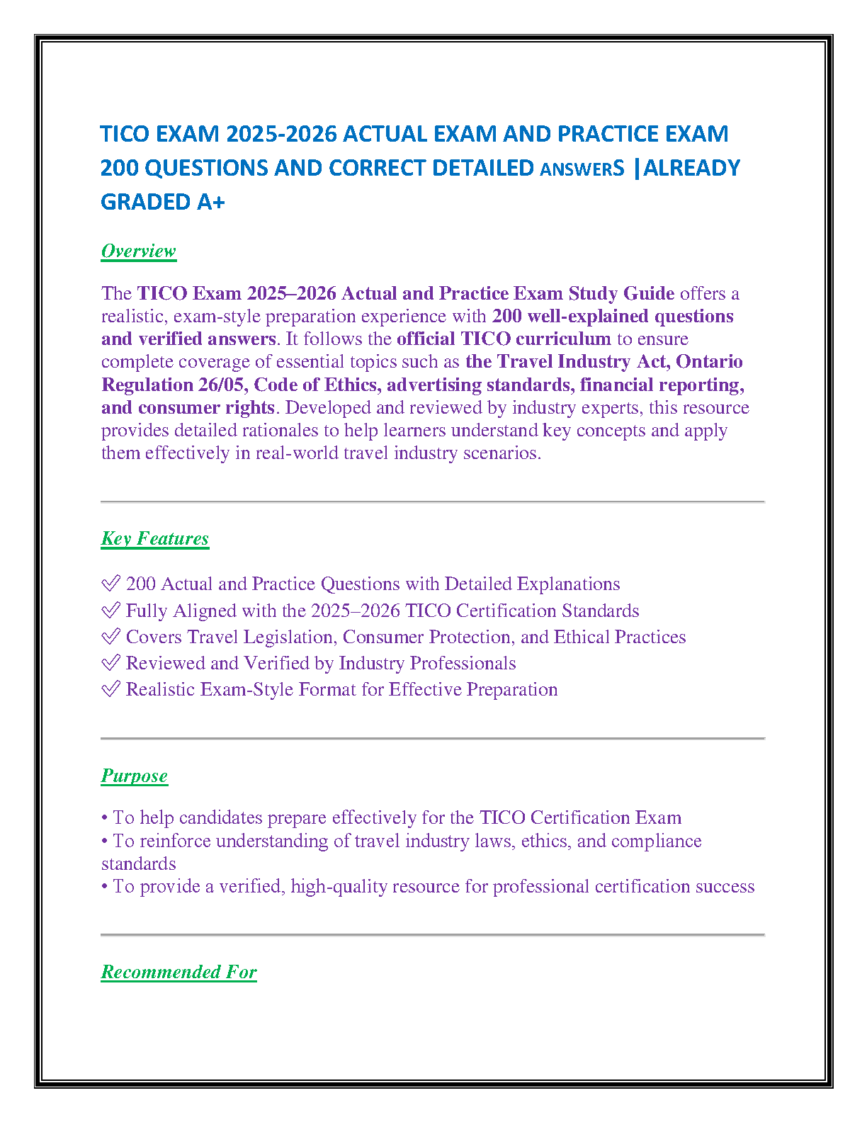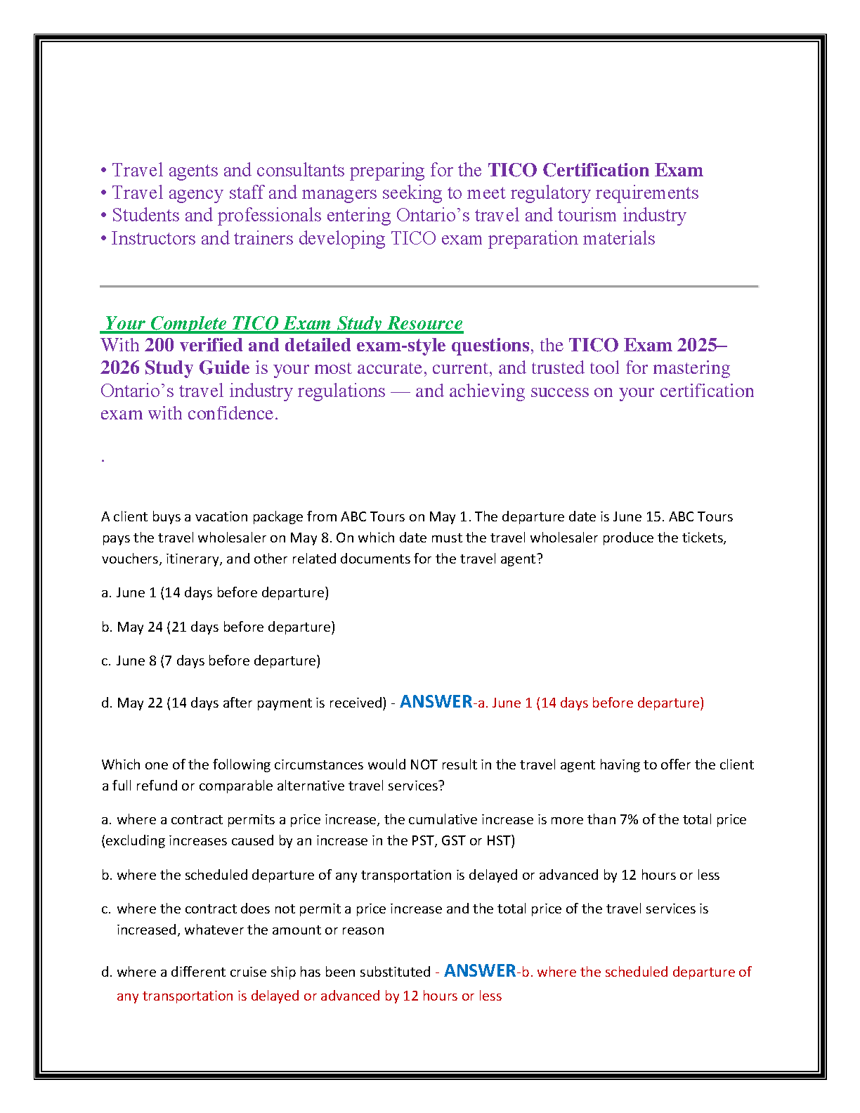 Ace your TICO Certification Exam on the first attempt with our comprehensive 2025-2026 Test Bank. This premium study resource provides 200 actual exam-style questions, each accompanied by detailed, expert-verified answers and rationales. Fully updated and aligned with the latest TICO curriculum, this guide covers all essential topics, including the Travel Industry Act, Ontario Regulation 26/05, Code of Ethics, and consumer rights. Designed by industry professionals to simulate the real testing experience, this is the ultimate tool to help you pass with confidence and avoid resits.