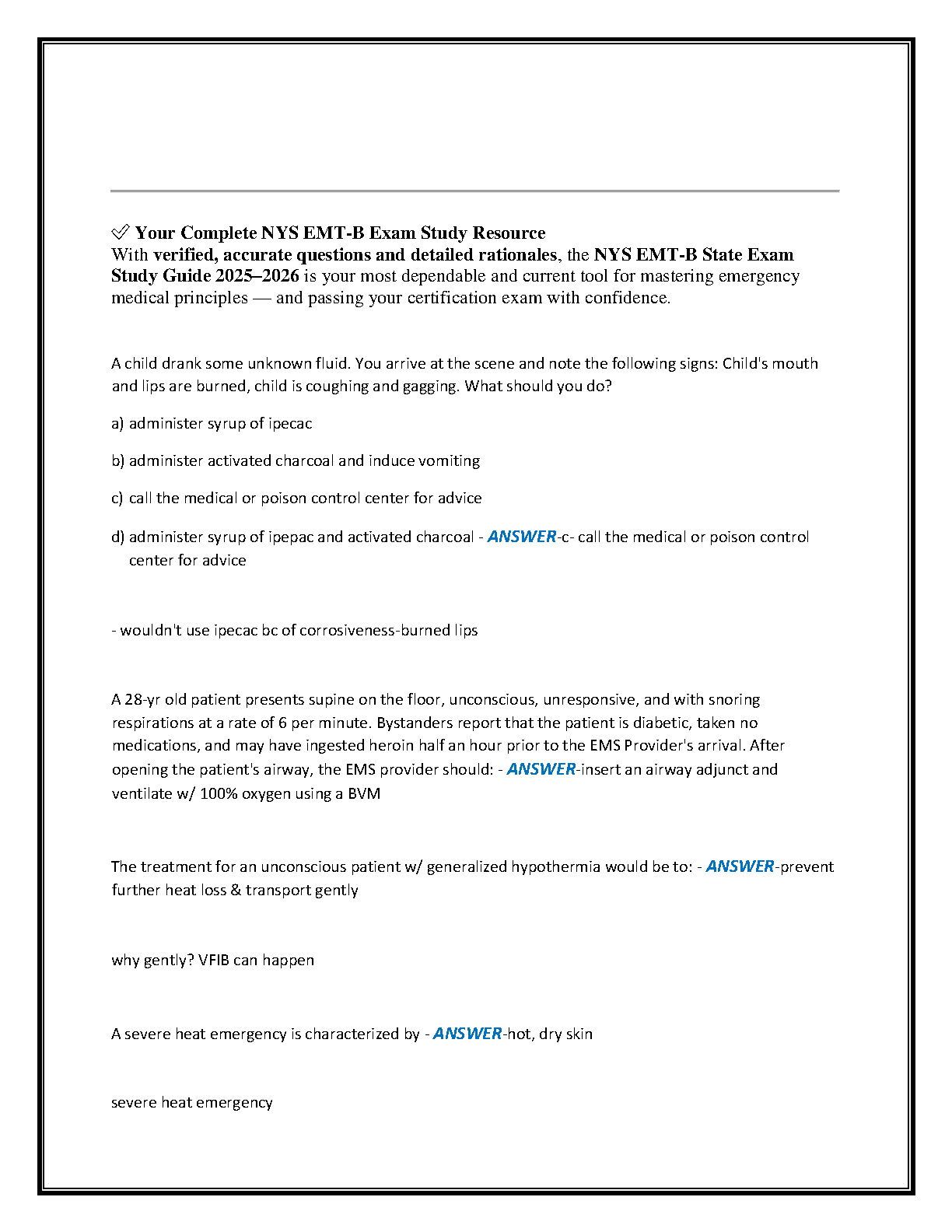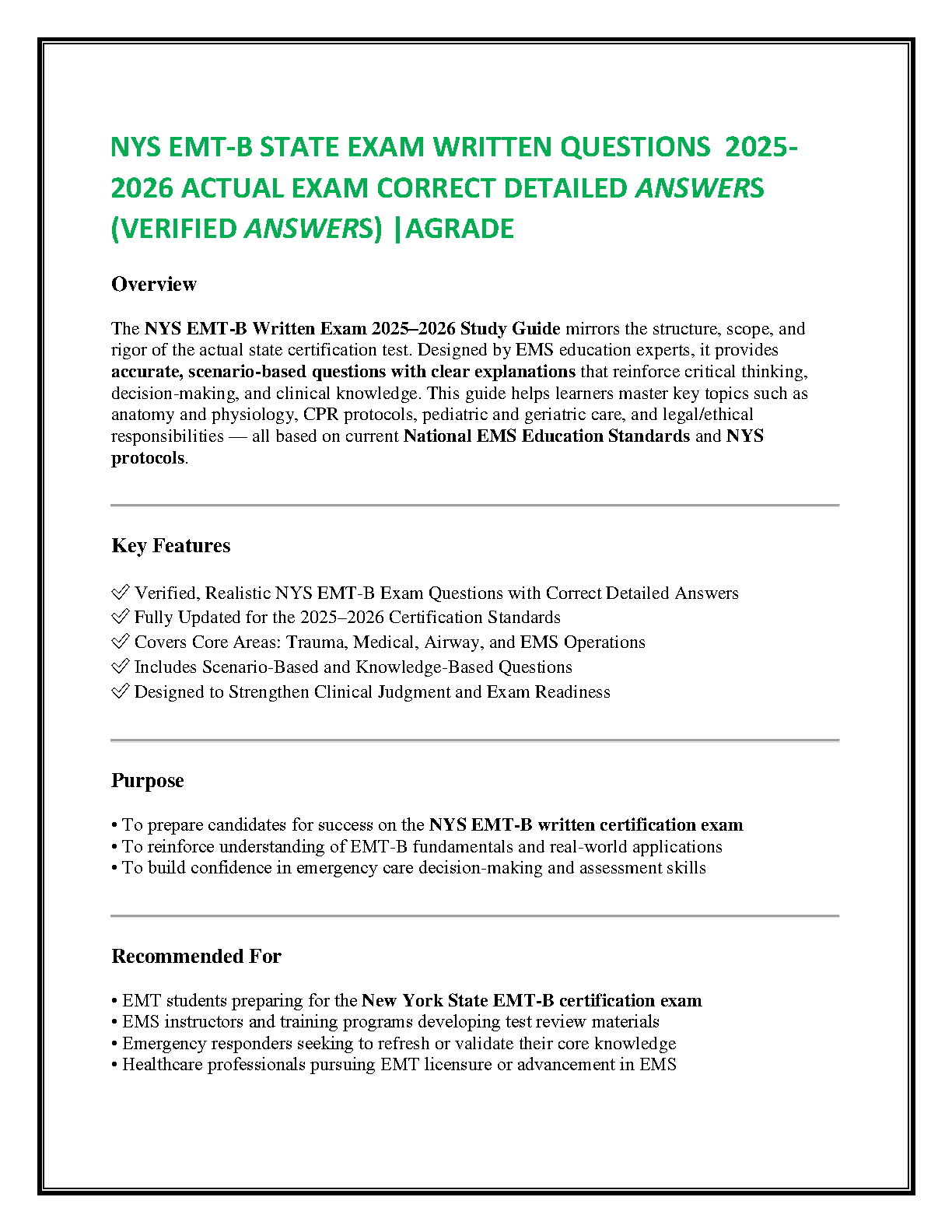 Ace your New York State EMT-Basic certification exam with our premier 2025-2026 study guide! This comprehensive test bank is expertly crafted to reflect the latest NYS EMT-B written exam, providing a realistic and effective preparation experience. Inside, you'll find a wealth of verified, scenario-based questions complete with detailed, easy-to-understand answers and rationales. This resource is designed to sharpen your critical thinking and clinical judgment, ensuring you have the confidence and knowledge to succeed on your first attempt. It covers all core areas including Trauma, Medical, Airway, and EMS Operations, all fully aligned with current National EMS Education Standards and NYS protocols.