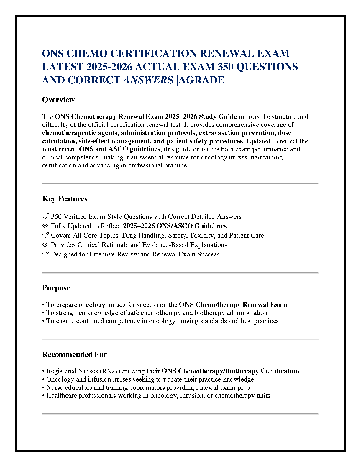 ONS Chemotherapy Certification Renewal Exam Test Bank 2025-2026 with 350 Real Questions and Expert-Verified Answers