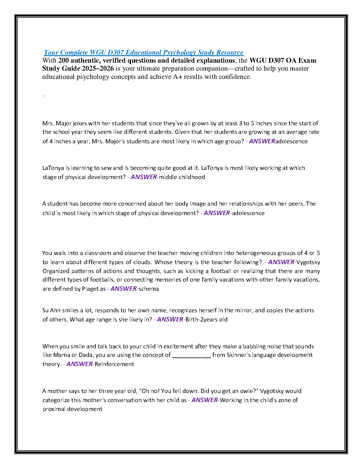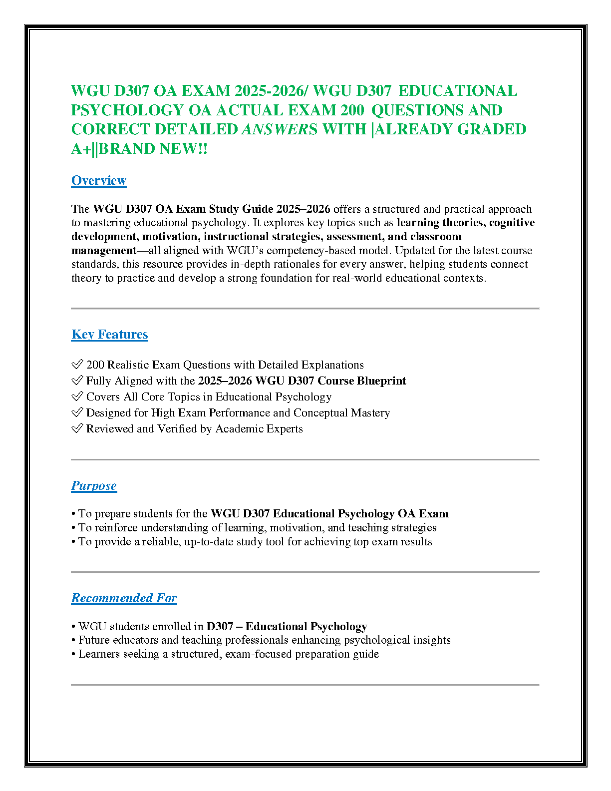 Ace your WGU D307 Educational Psychology Objective Assessment with this newly released study guide for the 2025-2026 academic year. This comprehensive resource is designed to help you pass on your first attempt, featuring 200 realistic exam questions, each accompanied by detailed, expert-verified answers and rationales. Fully aligned with the latest WGU D307 course blueprint, this guide covers all essential topics, including learning theories, cognitive development, motivation, assessment, and classroom management. Master the core concepts and excel in your exam with this essential preparation tool.