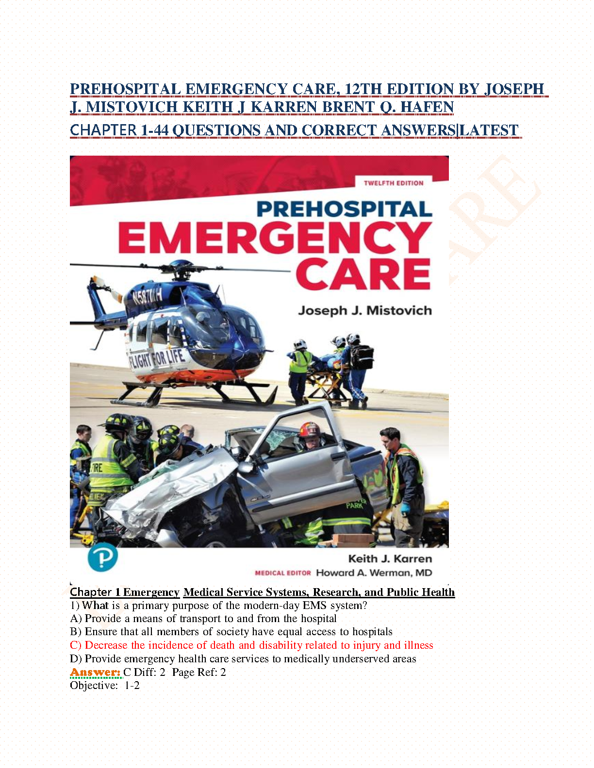 Master your EMS course with the official Test Bank for Prehospital Emergency Care, 12th Edition by Mistovich, Karren, and Hafen. This comprehensive study tool includes a complete collection of exam questions and verified correct answers covering all chapters from 1 to 44. It is expertly designed to help you test your knowledge, understand complex concepts, and prepare effectively for your exams. Gain the confidence you need to excel in your studies and pass your certification on the first attempt.