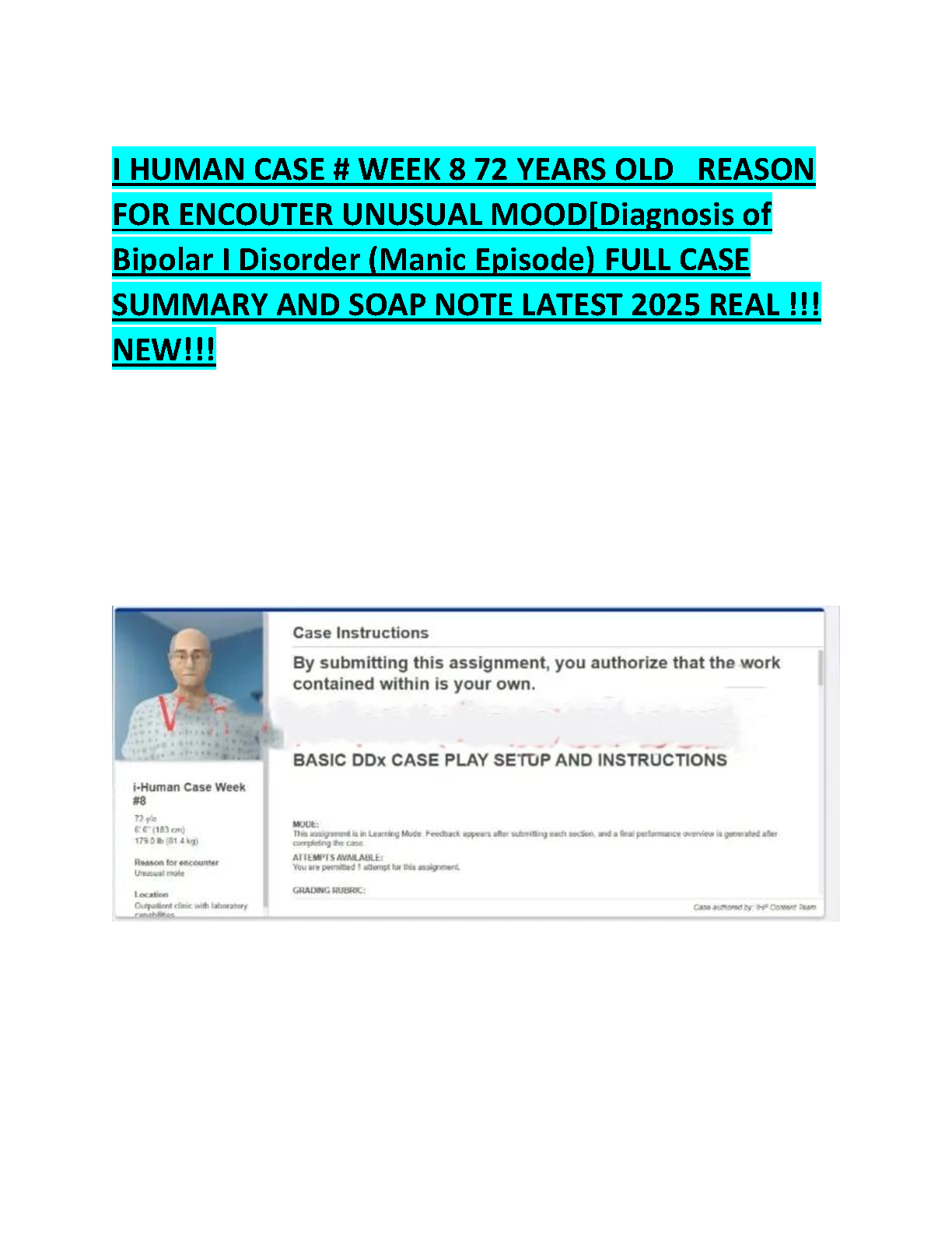 Unlock the complete solution for the i-Human Week 8 case study, focusing on a 72-year-old patient presenting with an unusual mood, diagnosed with Bipolar I Disorder (Manic Episode). This comprehensive guide for the 2025/2026 academic year includes a meticulously crafted full case summary and a detailed SOAP note, covering all aspects from patient history to diagnosis and management plan. Ideal for nursing and medical students, this resource is your key to mastering clinical reasoning, acing your i-Human assignments, and passing your exams on the first attempt.