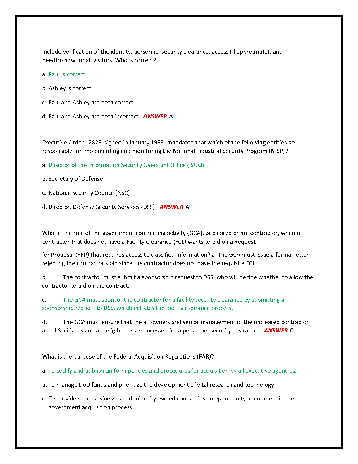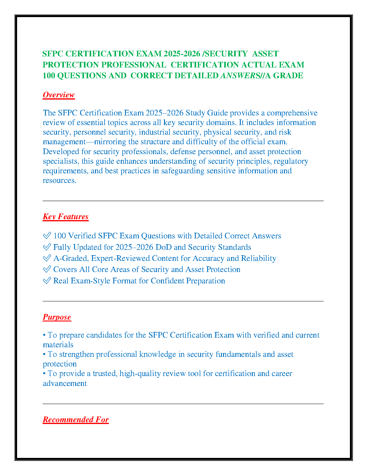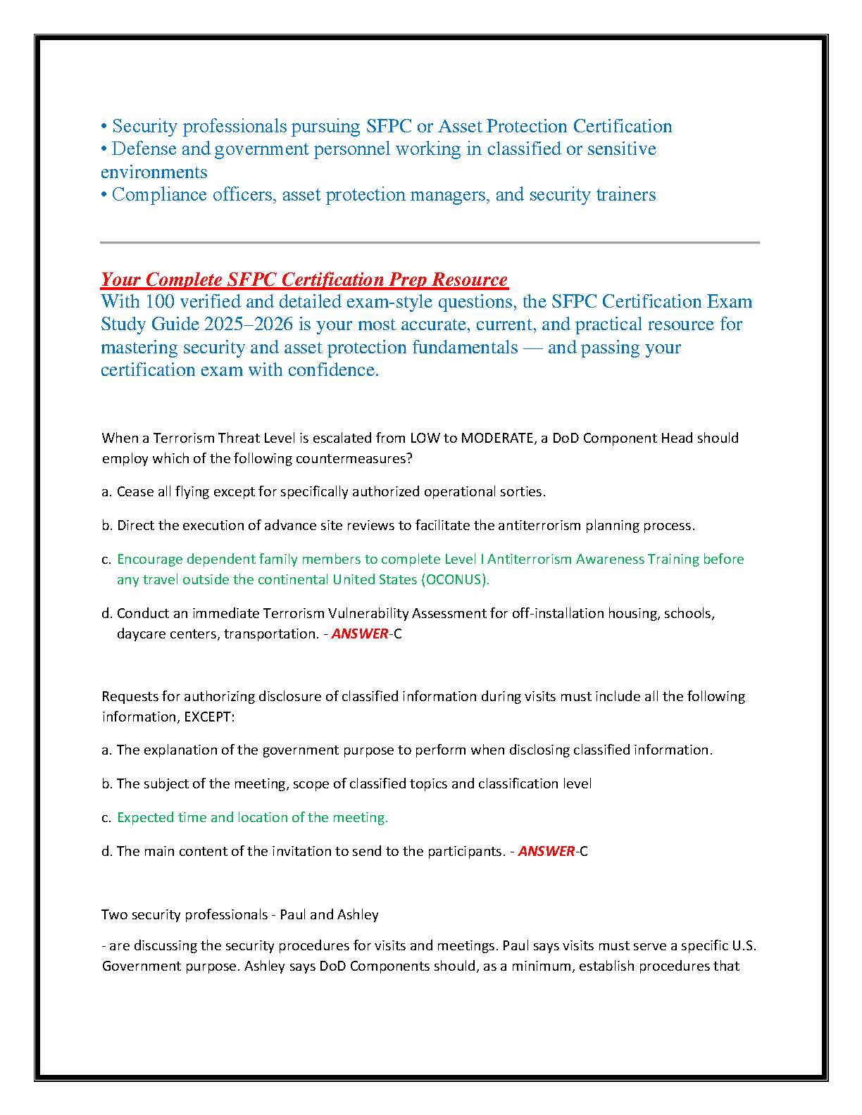 Master the SFPC Security Asset Protection Professional Certification Exam with our comprehensive 2025-2026 study guide. This A-grade test bank features over 100 meticulously verified questions, each with a detailed, correct answer to ensure you grasp the core concepts. Our content is fully updated for the latest 2025-2026 DoD security standards. Gain confidence by tackling topics across all essential domains, including information security, personnel security, industrial security, physical security, and risk management. Designed to mirror the actual exam's structure and difficulty, this resource is your ultimate tool for confident preparation. Avoid resits and achieve your certification on the first try. Ideal for security professionals, defense personnel, and asset protection specialists.