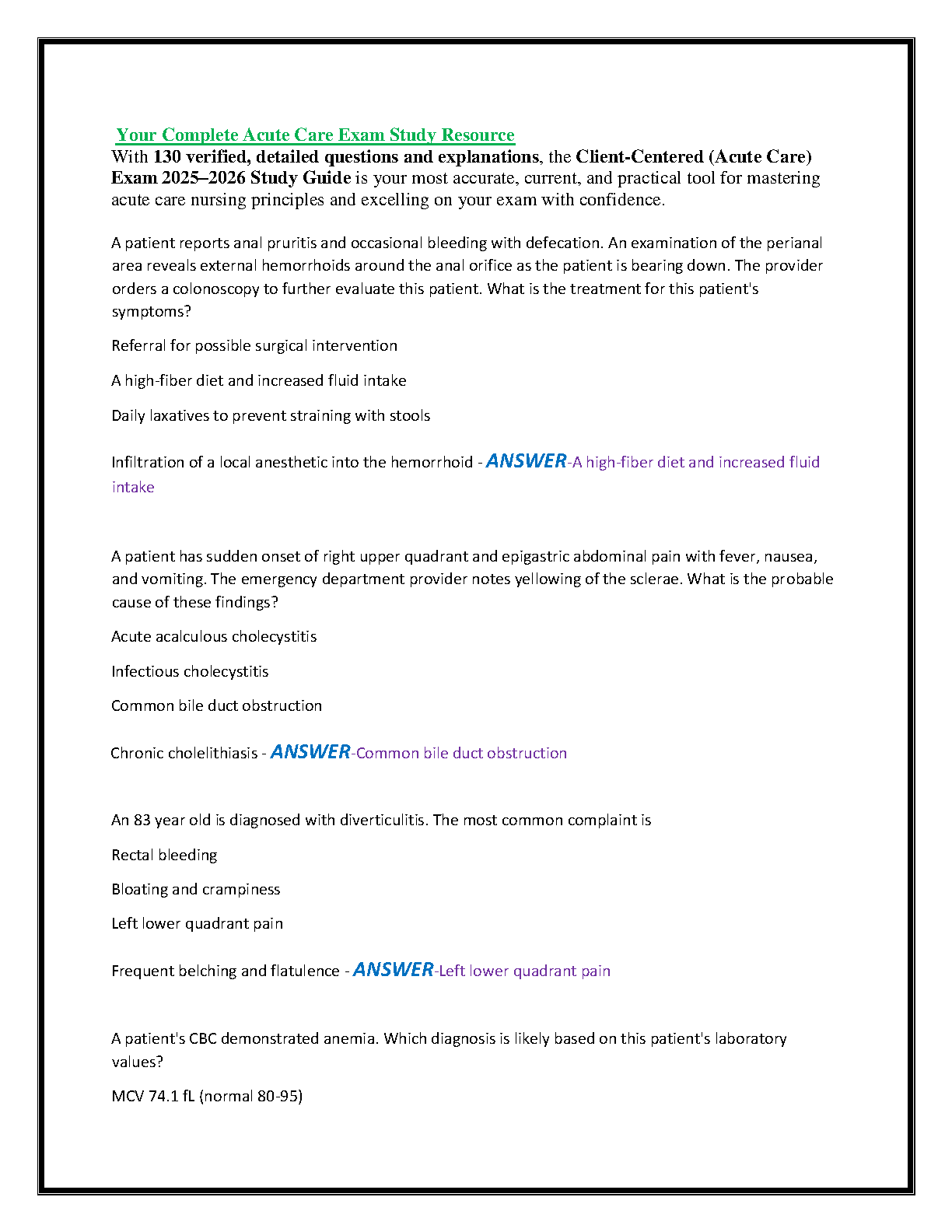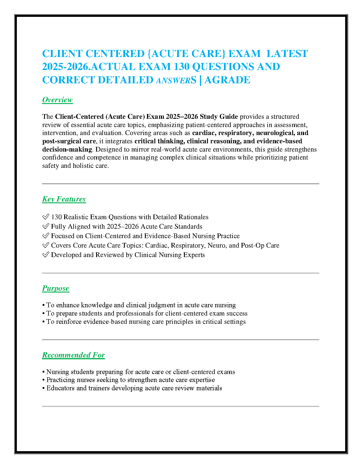 Excel in your Client-Centered Acute Care exam with our comprehensive 2025-2026 study guide. This premium test bank features 130 realistic exam-style questions, each accompanied by detailed, correct answers and expert rationales. Developed by clinical nursing specialists, this resource is fully updated and aligned with the latest 2025-2026 acute care nursing standards. Gain mastery over essential topics including cardiac, respiratory, neurological, and post-surgical care. Our guide is designed to sharpen your critical thinking and clinical reasoning, preparing you for complex real-world scenarios. Ideal for nursing students and practicing nurses, this guide is your key to achieving exam success on your first attempt.