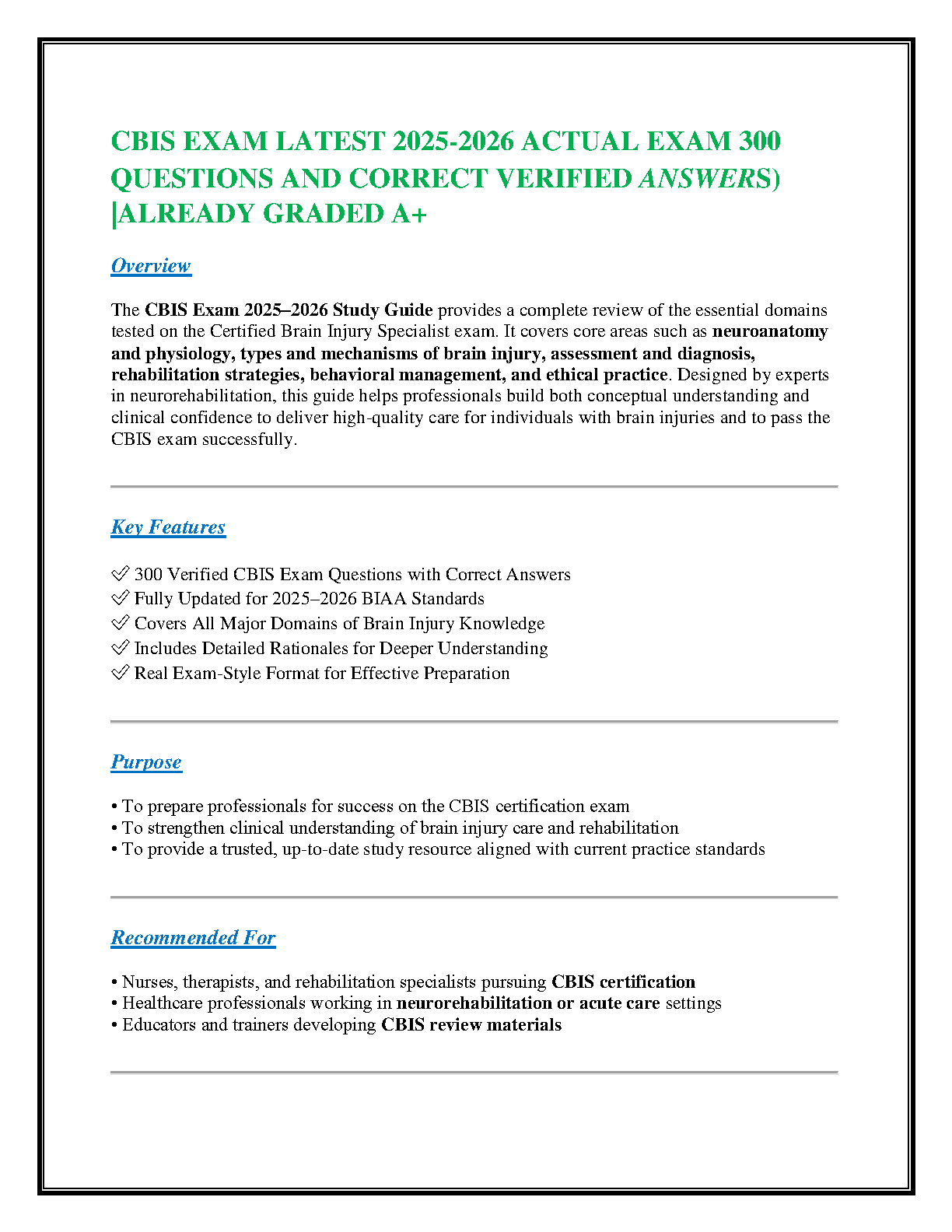 CBIS Certified Brain Injury Specialist Exam Test Bank 2025-2026: 300 A+ Graded Questions & Verified Answers for First-Time Pass