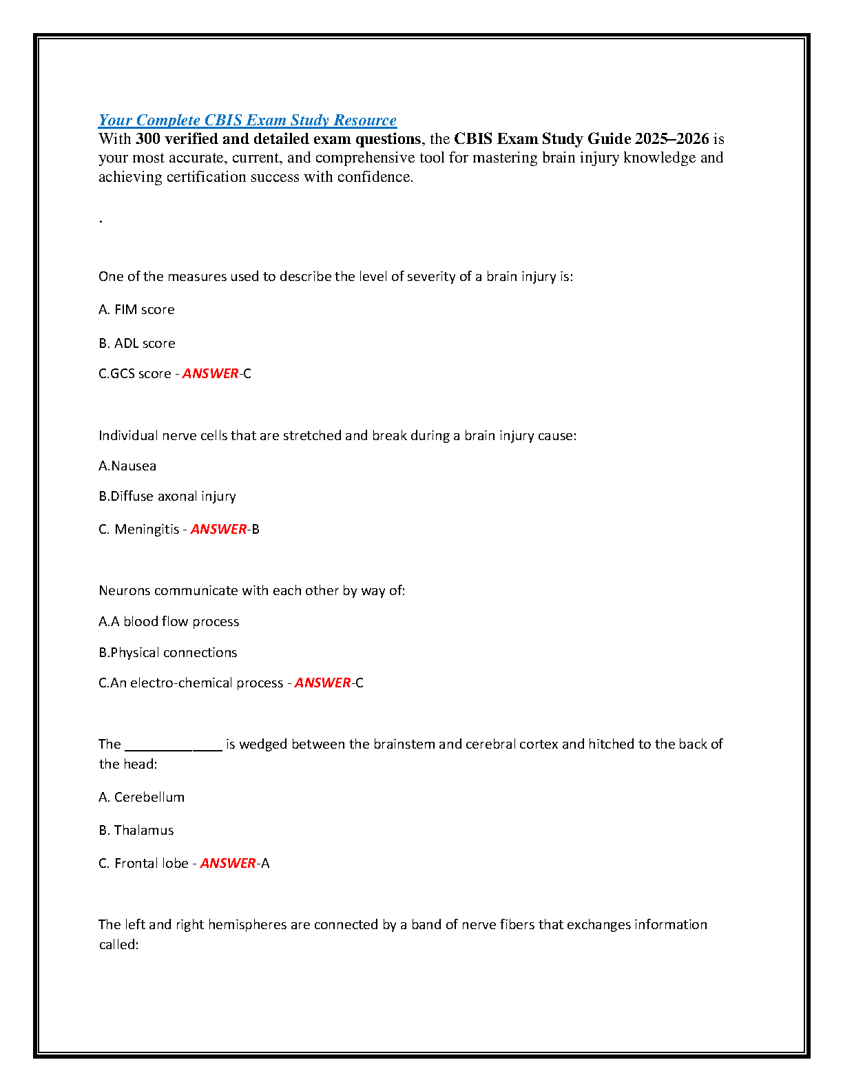 Ace your Certified Brain Injury Specialist (CBIS) exam on the first try with our comprehensive 2025-2026 test bank. This essential study resource features 300 meticulously verified questions, complete with correct answers and detailed rationales, designed to mirror the actual exam format. Expertly crafted to cover all critical domains—from neuroanatomy and rehabilitation strategies to ethical practice—this guide builds the conceptual and clinical confidence you need for success. Fully updated to meet the 2025-2026 BIAA standards, it is the ultimate tool for nurses, therapists, and healthcare professionals dedicated to excelling in brain injury care and achieving CBIS certification.
