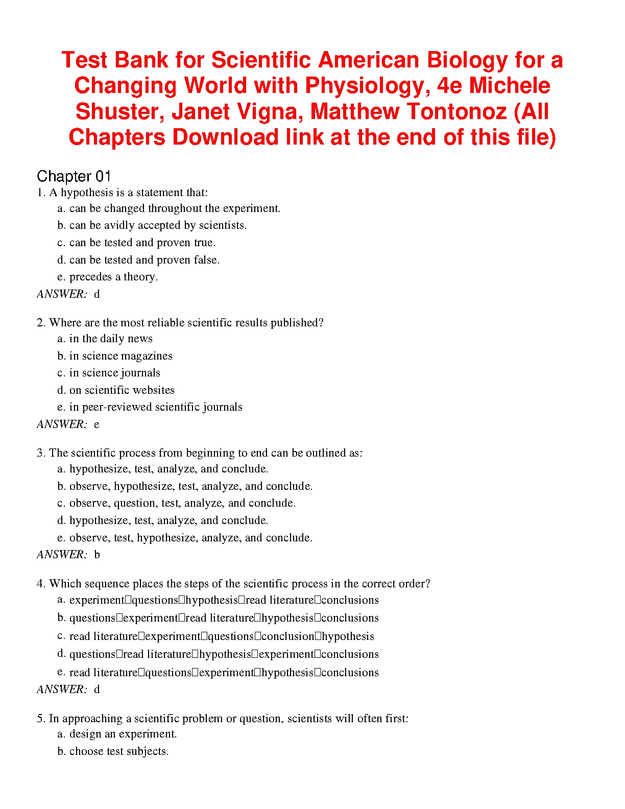 Test Bank for Scientific American Biology for a Changing World with Physiology, 4TH EDITION BY Michele Shuster, Janet Vigna, Matthew Tontonoz (All Chapters). DOWNLOAD on www.hackedexams.com INSTANTLY.