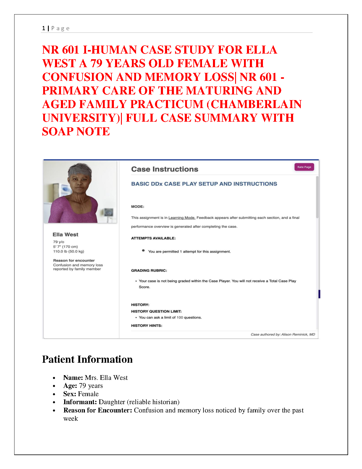 NR 601 i-Human Case Study: Ella West - Confusion and Memory Loss | Chamberlain University | Complete SOAP Note & Case Summary by Alison Reminick, MD