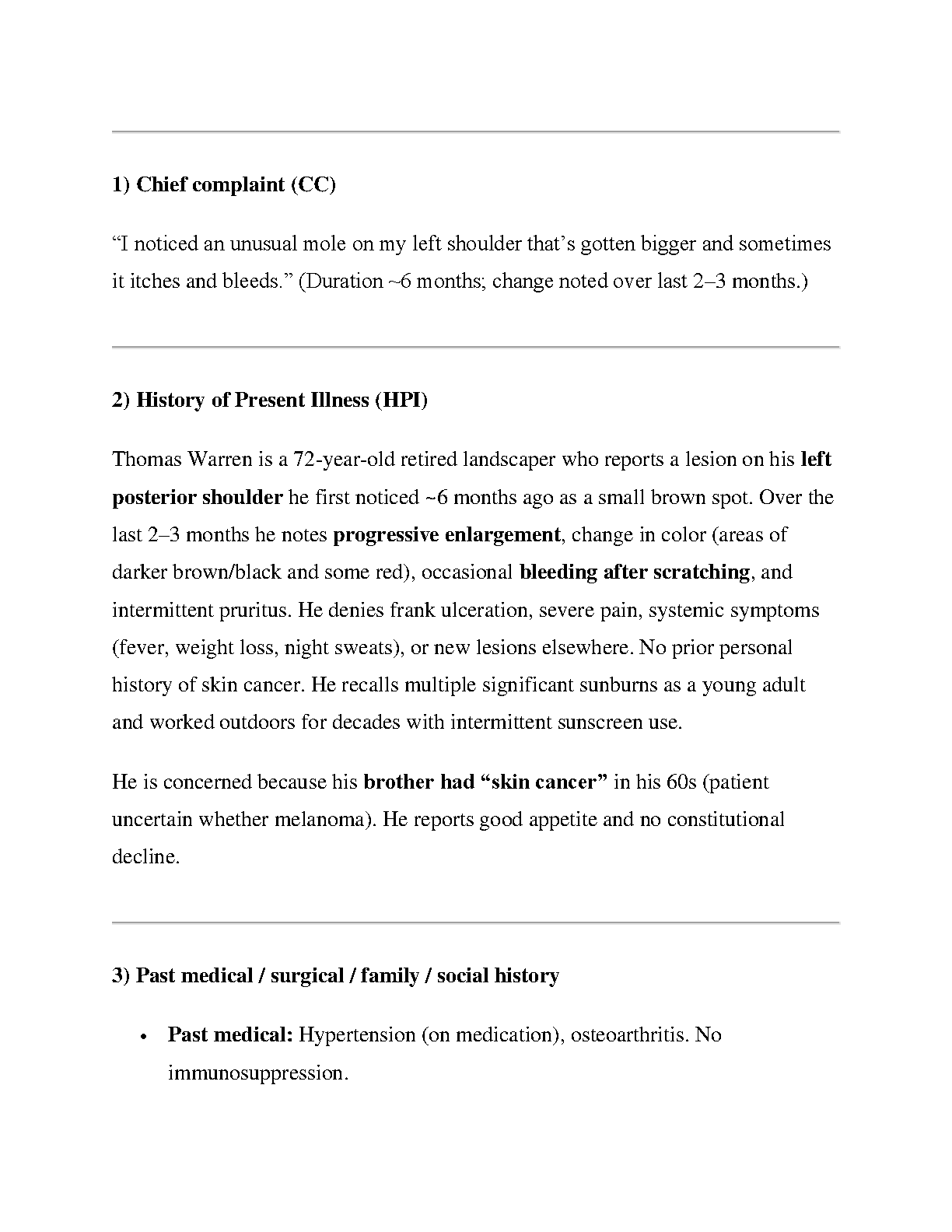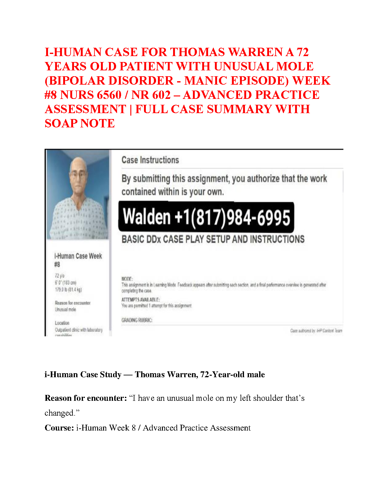 Access the complete and verified iHuman case study solution for NURS 6560 and NR 602, Week 8, featuring the patient Thomas Warren. This comprehensive guide, updated for the 2025/2026 academic year, covers the assessment of a 72-year-old male presenting with an unusual mole, while also managing his Bipolar Disorder (Manic Episode). Our resource includes a full case summary, a meticulously crafted SOAP note, key findings, and differential diagnoses to help you master the Advanced Practice Assessment. This is the ultimate tool to ensure you understand the case thoroughly, excel in your assignment, and pass your exams on the first attempt, avoiding any resits.