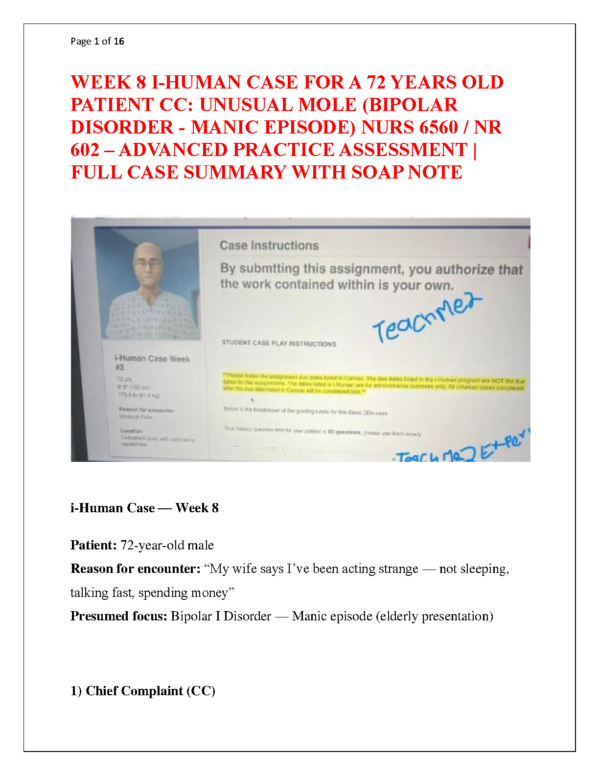 Unlock exam success with our comprehensive 2025/2026 guide for the Week 8 i-Human case study from NURS 6560 / NR 602. This detailed resource focuses on a 72-year-old male patient exhibiting classic signs of a manic episode, including hyperactivity, rapid speech, and impulsive spending, pointing to a diagnosis of Bipolar I Disorder in an elderly patient. Inside, you'll find a meticulously crafted full case summary and a complete SOAP note, providing the verified answers and structure you need to excel in your Advanced Practice Assessment. Download now to master the case, secure a top grade, and pass your exams on the first attempt.