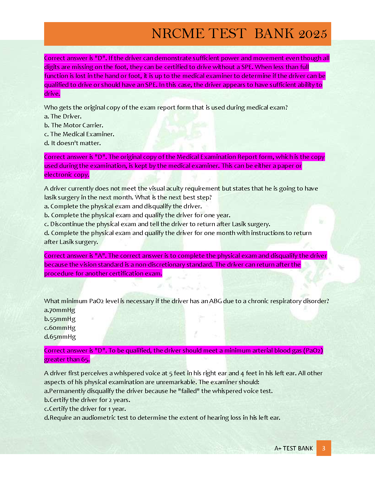Ace your National Registry of Certified Medical Examiners (NRCME) exam on the first try with our comprehensive 2025/2026 test bank. This premium study guide features a complete collection of 400 practice questions, each accompanied by a correct, detailed answer and a thorough rationale to deepen your understanding. This resource has been verified and graded A+, ensuring you are studying with the most accurate and effective material available. Designed for medical professionals preparing for the FMCSA certification, this test bank covers all essential topics and is your key to passing with confidence and avoiding costly resits. Get fully prepared and become a certified medical examiner with ease.