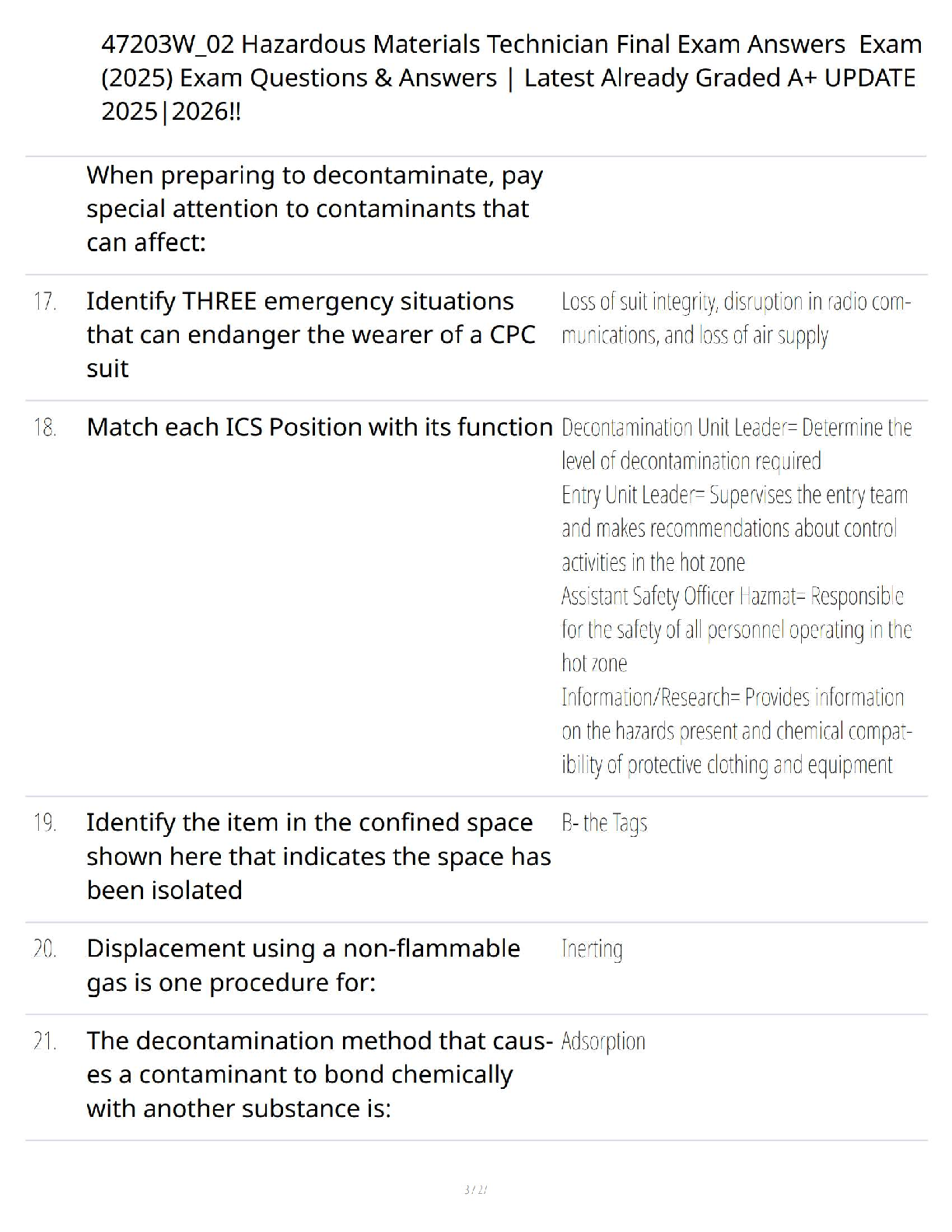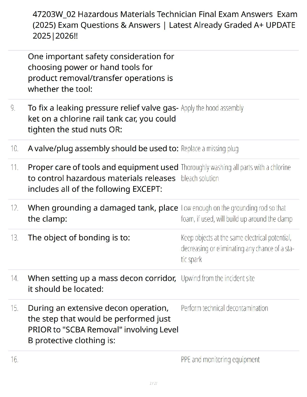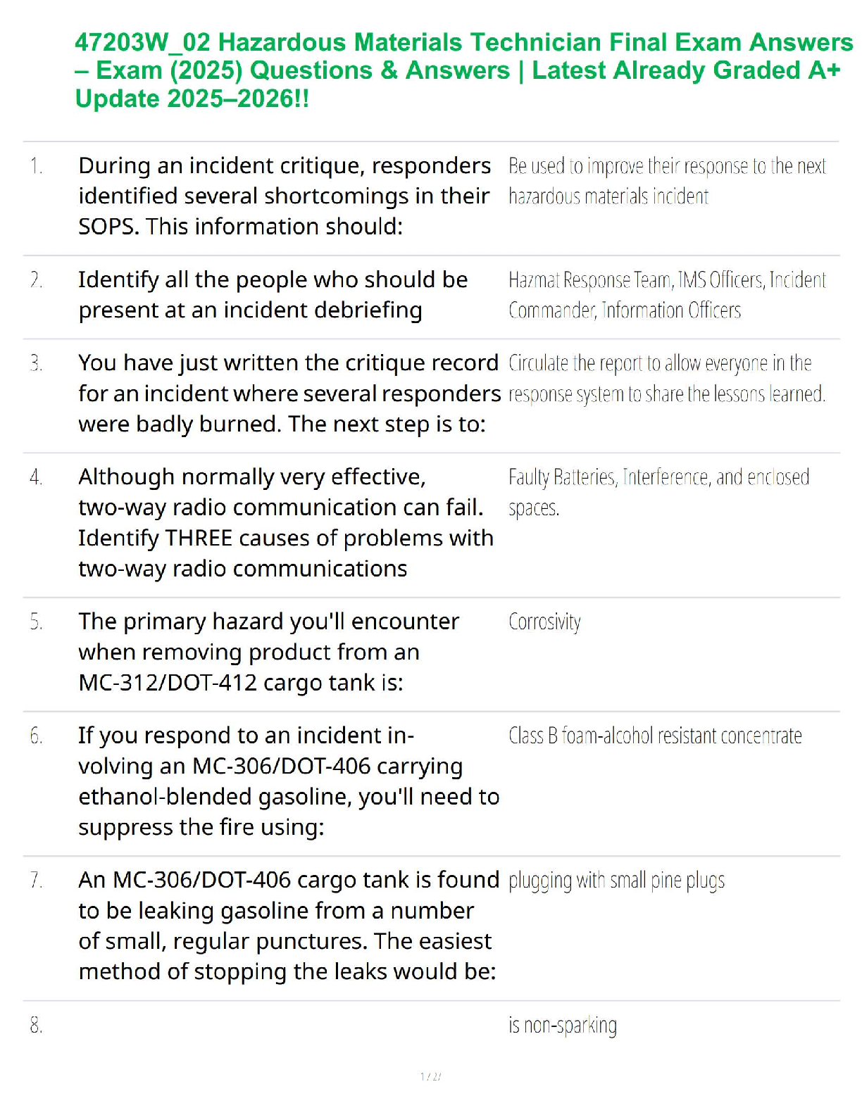 Get ready to ace your Hazardous Materials Technician Final Exam with our latest 2025-2026 test bank for course 47203W_02. This comprehensive study guide is packed with verified questions and A+ graded answers, covering all critical topics you'll face on the exam. From incident debriefing and radio communication protocols to identifying hazards in various cargo tanks like the MC-312/DOT-412, our resource provides the exact material you need to study effectively. This guide is your ultimate tool to build confidence, master the content, and pass your Hazmat Tech certification on the very first attempt, avoiding costly resits. Download now and start preparing for success!