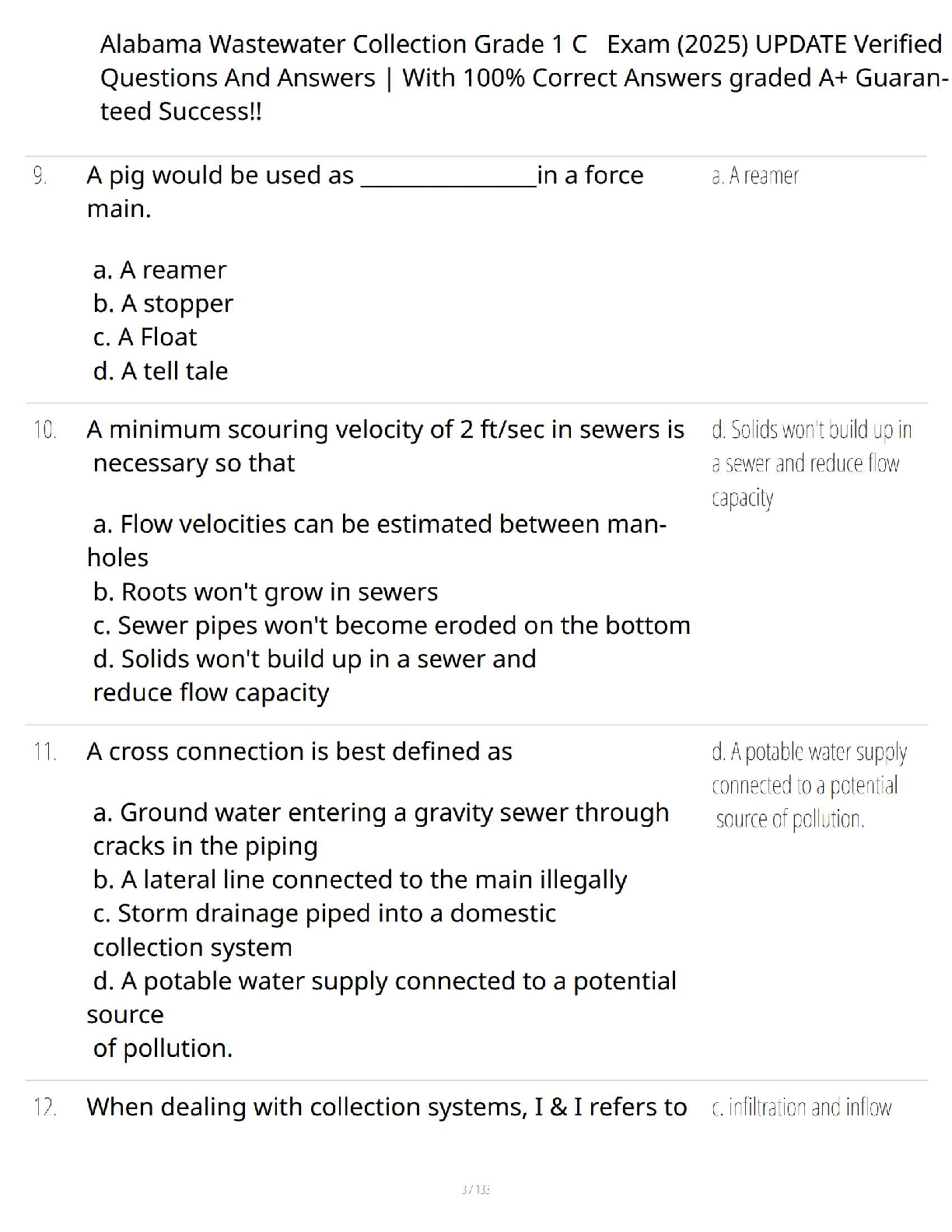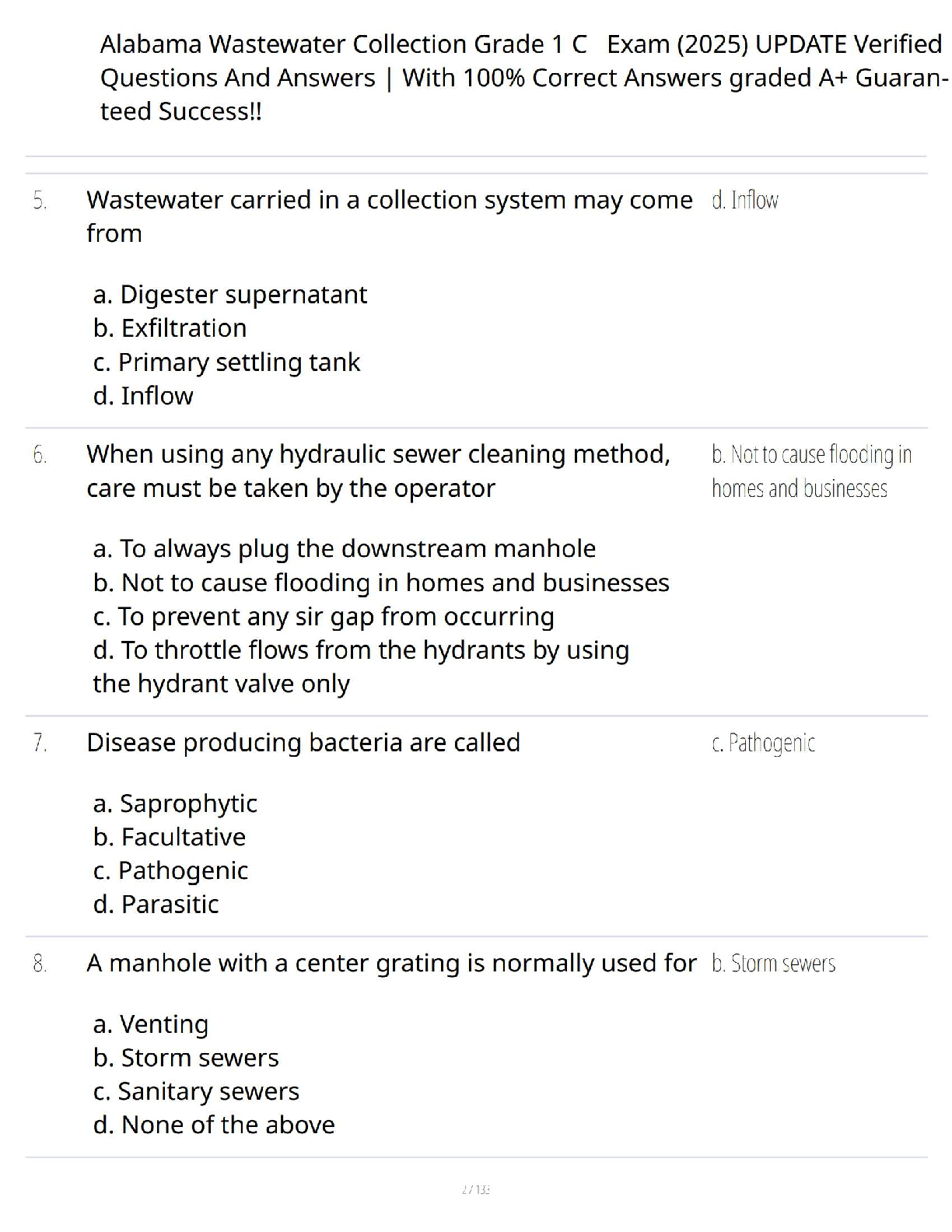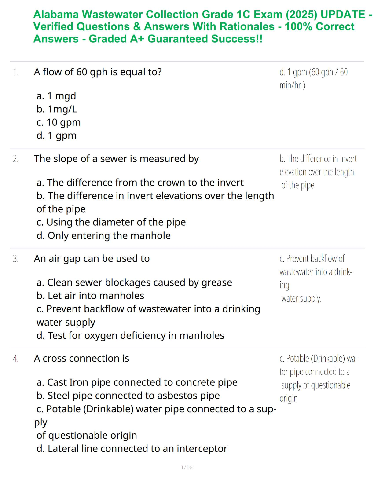 Master the Alabama Wastewater Collection Grade 1C Exam with our newly updated 2025/2026 study guide. This comprehensive resource features a collection of verified exam questions, complete with 100% accurate answers and detailed rationales to deepen your understanding. Designed to ensure your success, this guide covers all essential topics, from flow rate calculations to sewer system design. Prepare effectively, build confidence, and pass your certification exam on the first attempt with an A+ grade!