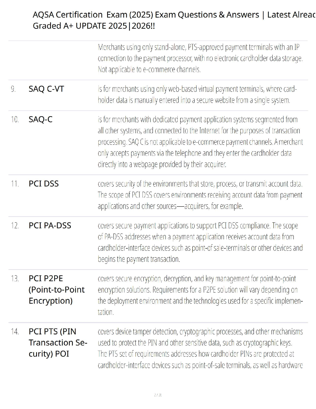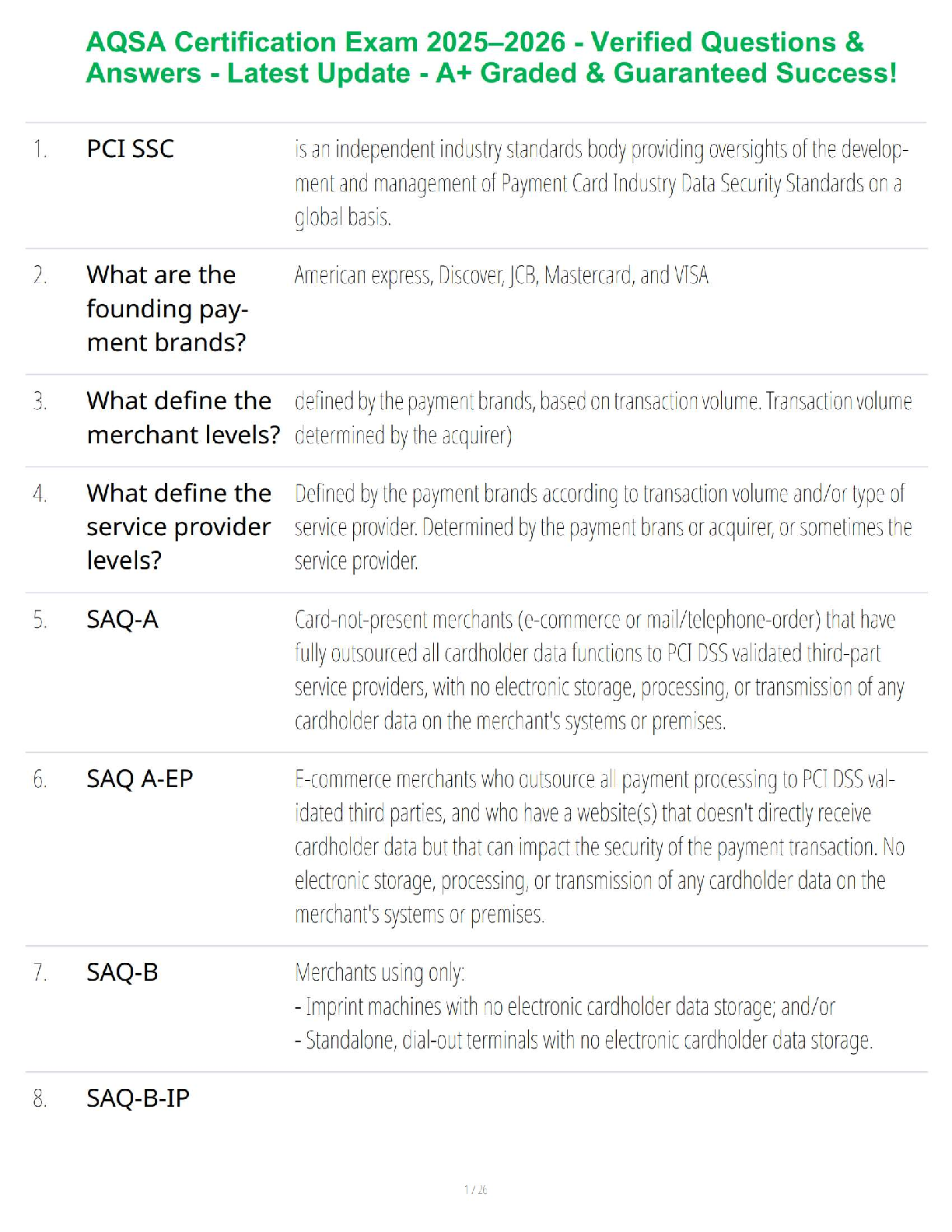 Unlock your success in the PCI DSS Qualified Security Assessor (QSA) Certification Exam with our latest 2025-2026 test bank. This comprehensive resource is packed with verified questions and detailed, accurate answers designed to ensure you pass on your first try. Covering all critical topics, including the roles of the PCI SSC, founding payment brands, merchant and service provider levels, and the nuances of Self-Assessment Questionnaires (SAQ-A, SAQ A-EP, SAQ-B, etc.), this guide is your ultimate study partner. Prepare effectively, master the concepts, and achieve your certification goals without the stress of resits.