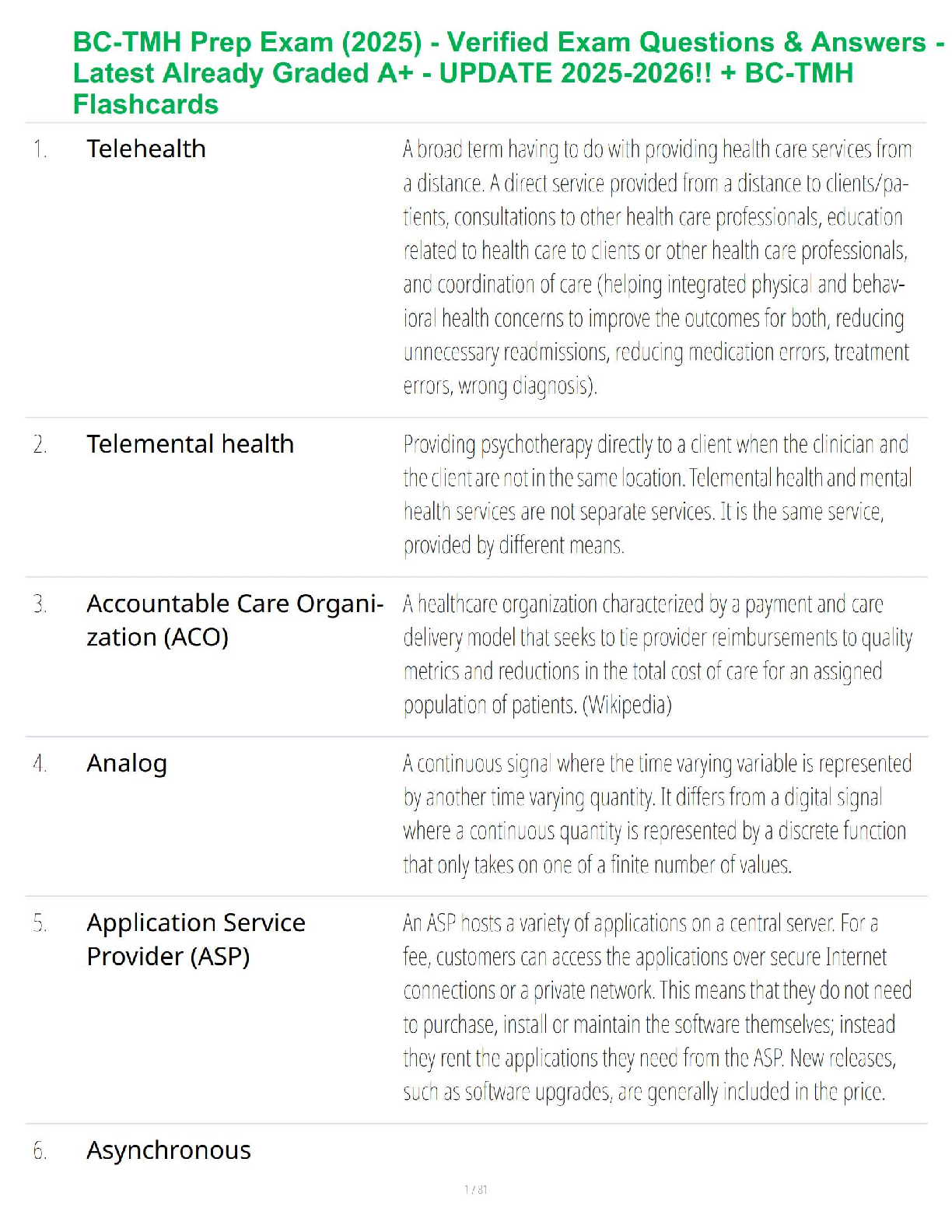 Ace your Board Certified-TeleMental Health Provider certification with our ultimate 2025/2026 prep package! This verified test bank is your key to success, featuring a comprehensive collection of the latest exam questions and detailed, A+ graded answers. Organized in an easy-to-use flashcard format, this study guide covers all critical topics, including telehealth, telemental health, ACOs, and more. Master the material, boost your confidence, and pass the BC-TMH exam on your first try. Avoid resits and fast-track your certification with this essential resource.