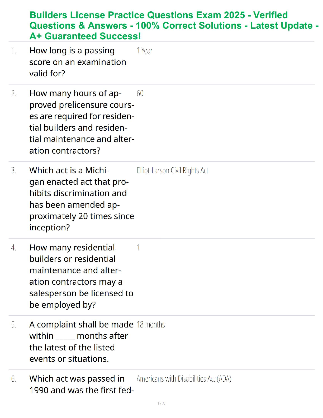 Prepare to pass your Michigan Builders License Exam with confidence using our latest 2025-2026 edition test bank. This comprehensive study guide is packed with verified questions and 100% correct, detailed answers to ensure you master the material. Covering essential topics from Michigan-specific laws like the Elliot-Larson Civil Rights Act to federal regulations and licensing procedures, this resource is expertly designed to help you succeed on your first attempt. Get the A+ grade you need and start your building career without the stress of resits!