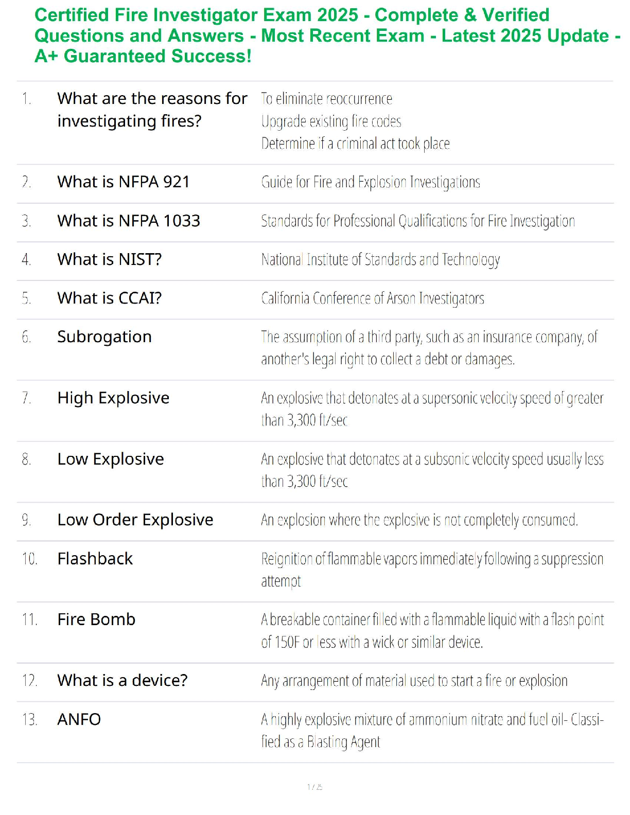 Ace your Certified Fire Investigator (CFI) exam on the very first try! This comprehensive test bank for the 2025/2026 academic year provides a complete and verified set of questions and answers covering all essential topics. Master key concepts such as the principles of fire investigation, NFPA 921 and NFPA 1033 standards, types of explosives, and critical legal terms like subrogation. Our expertly curated material is designed to mirror the actual exam format, ensuring you are fully prepared and confident. Avoid costly resits and fast-track your career with this ultimate study guide. Updated for 2025 to guarantee your A+ success.