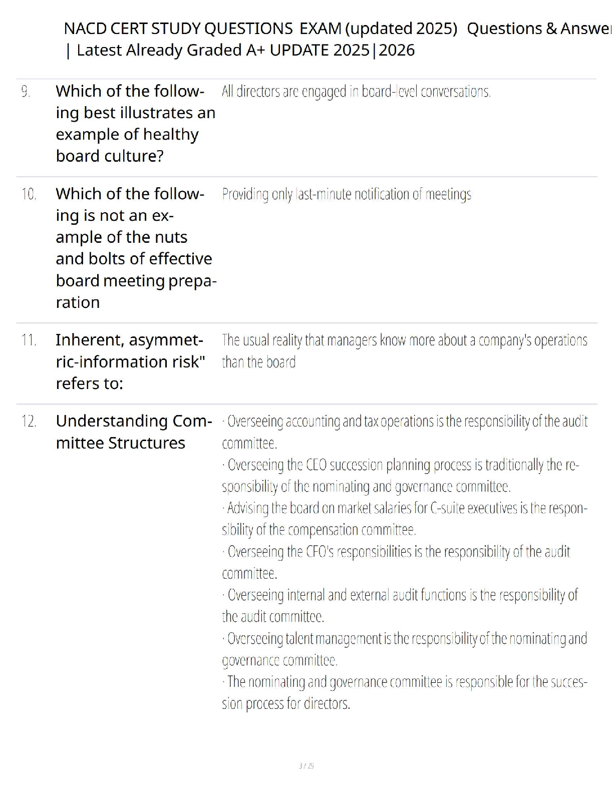 Ace your National Association of Corporate Directors (NACD) CERT exam with our newly updated 2025-2026 test bank. This comprehensive study resource is packed with verified questions and A+ graded answers, mirroring the actual exam format. Covering all essential topics in corporate governance, including director responsibilities, board structure, risk management, and federal regulations, this guide is your key to mastering the material. Prepare effectively, boost your confidence, and achieve certification on your first attempt with our guaranteed success formula.