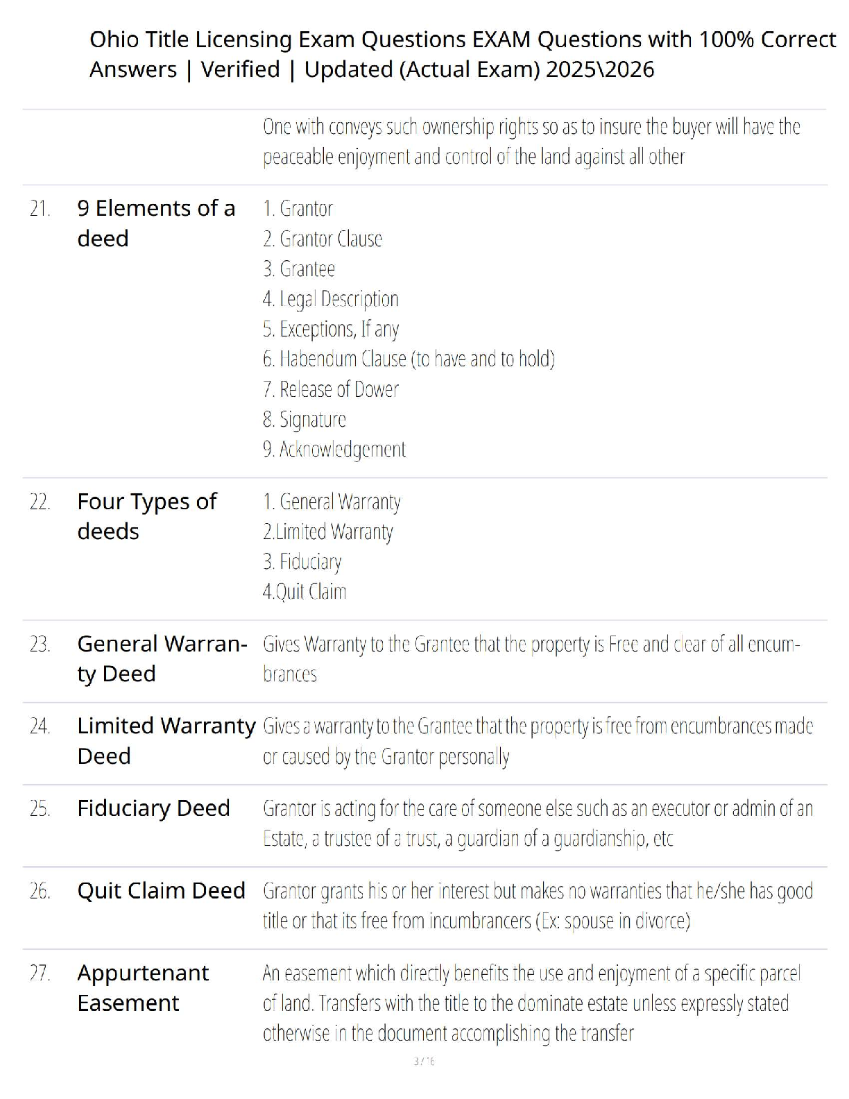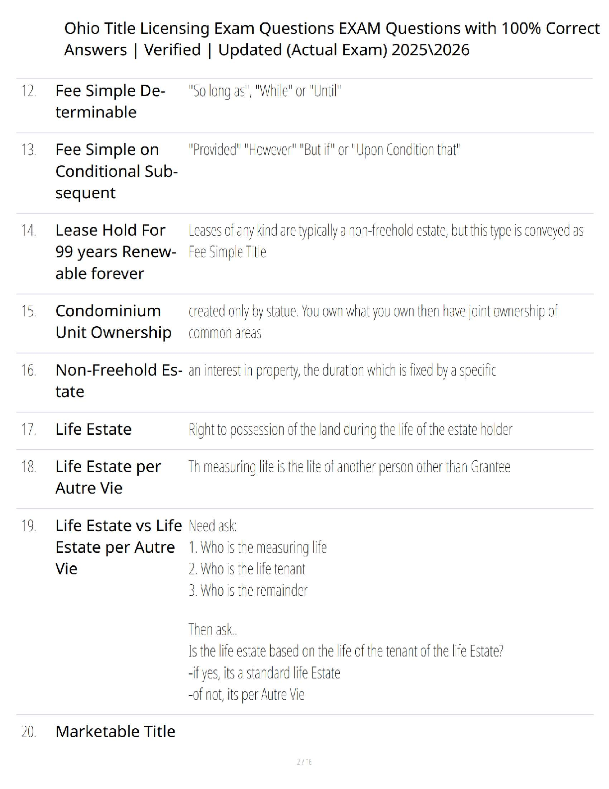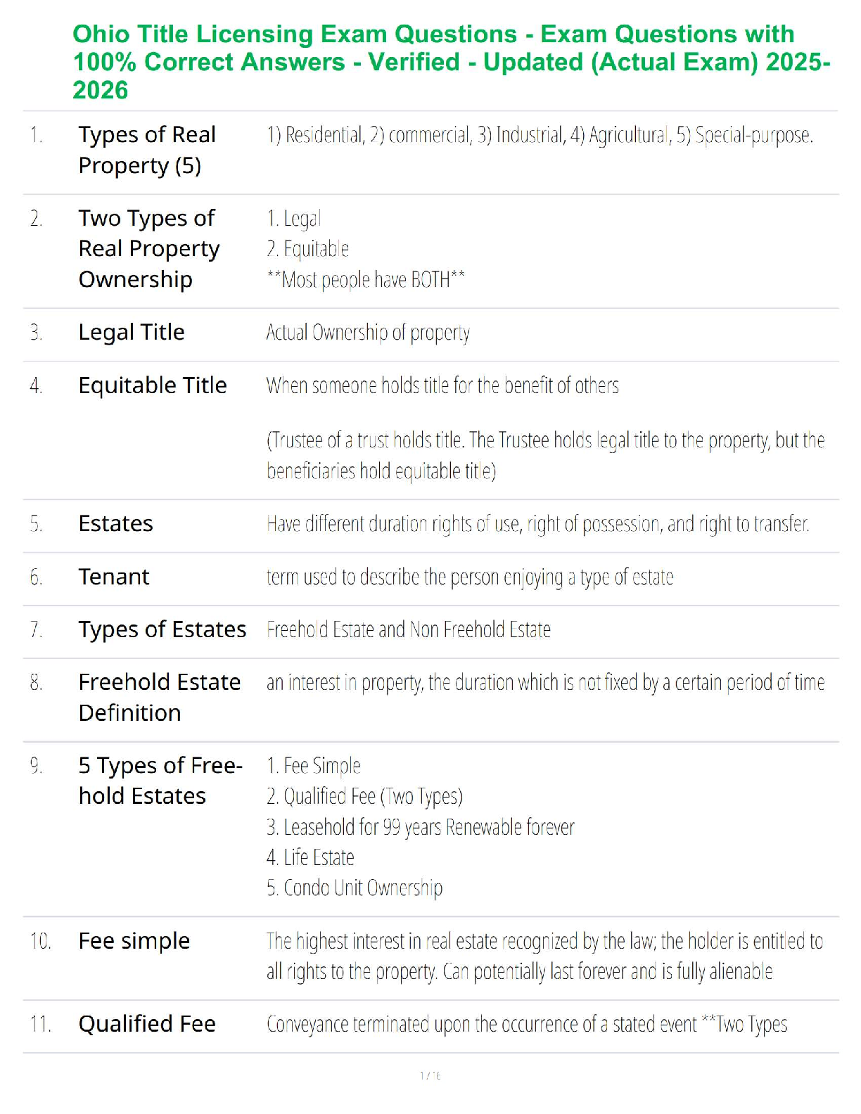 Prepare to ace your Ohio Title Licensing Exam on the first try with our comprehensive and fully updated test bank for the 2025-2026 academic year. This essential study resource features a meticulously compiled set of actual exam questions, each paired with a verified, 100% correct answer. Dive deep into crucial topics like Types of Real Property, Legal vs. Equitable Title, Freehold Estates, Fee Simple, and more. Our expertly crafted guide is designed to provide you with the exact knowledge and confidence needed to pass your certification exam effortlessly, eliminating the stress and expense of resits. Get instant access and start your journey to becoming a licensed title agent in Ohio today!