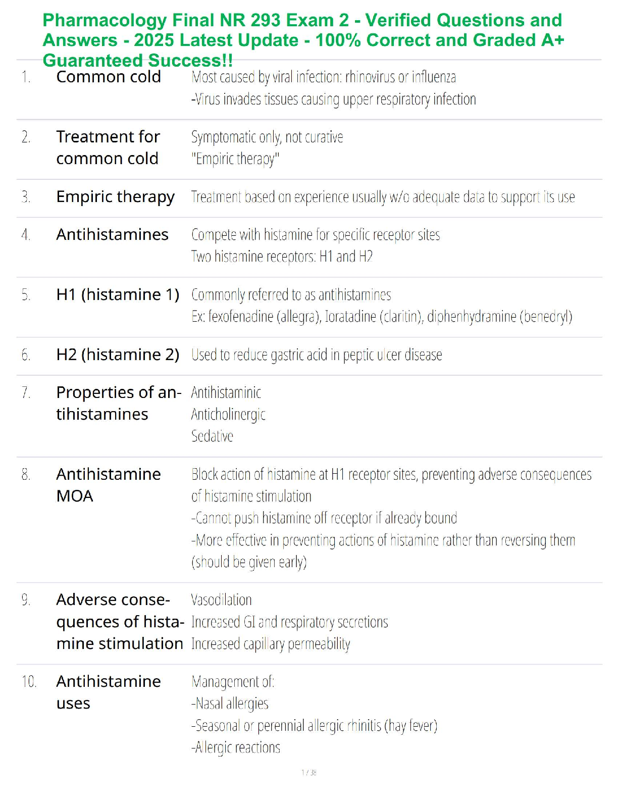 Ace your NR 293 Pharmacology final exam with our latest 2025/2026 study guide! This resource provides a complete set of verified questions and expertly crafted answers, designed to help you master complex topics and pass your exam on the first attempt, avoiding costly resits. The guide covers essential pharmacology concepts, including treatments for the common cold, mechanisms of antihistamines (H1 & H2), empiric therapy, and more. Each question is structured to reflect the actual exam format, ensuring you are fully prepared for success. Achieve a guaranteed A+ grade with this indispensable tool for nursing students.