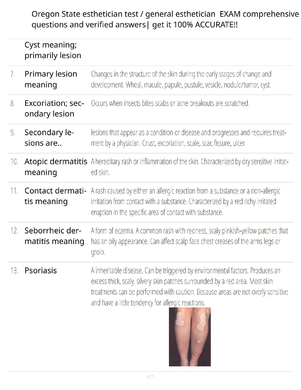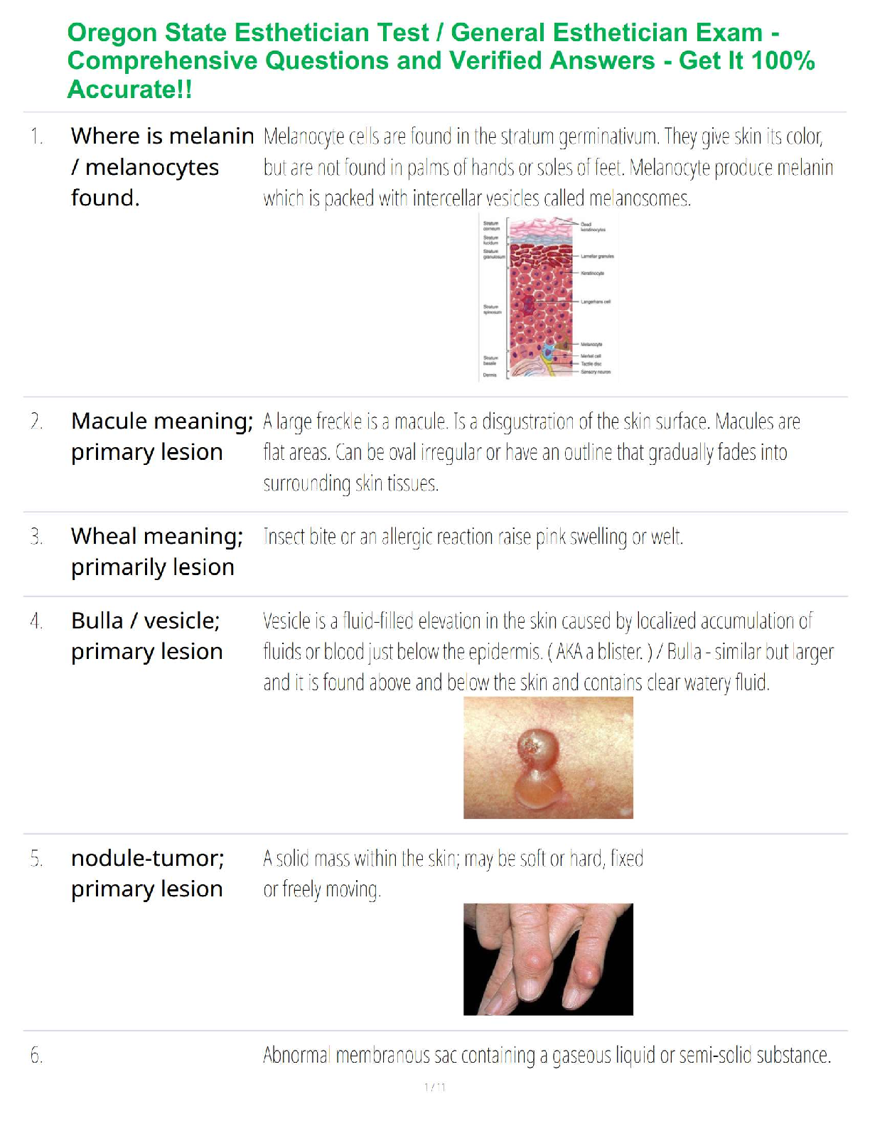 Ace your Oregon State General Esthetician Exam with confidence using our latest 2025/2026 test bank. This comprehensive study resource is packed with a wide range of questions and 100% accurate, verified answers covering all essential topics, from skin anatomy and primary lesions to safety and sanitation. Designed to help you master the material and pass on your first attempt, this guide is your key to avoiding costly resits and kickstarting your career as a licensed esthetician. Download now and get fully prepared for success!