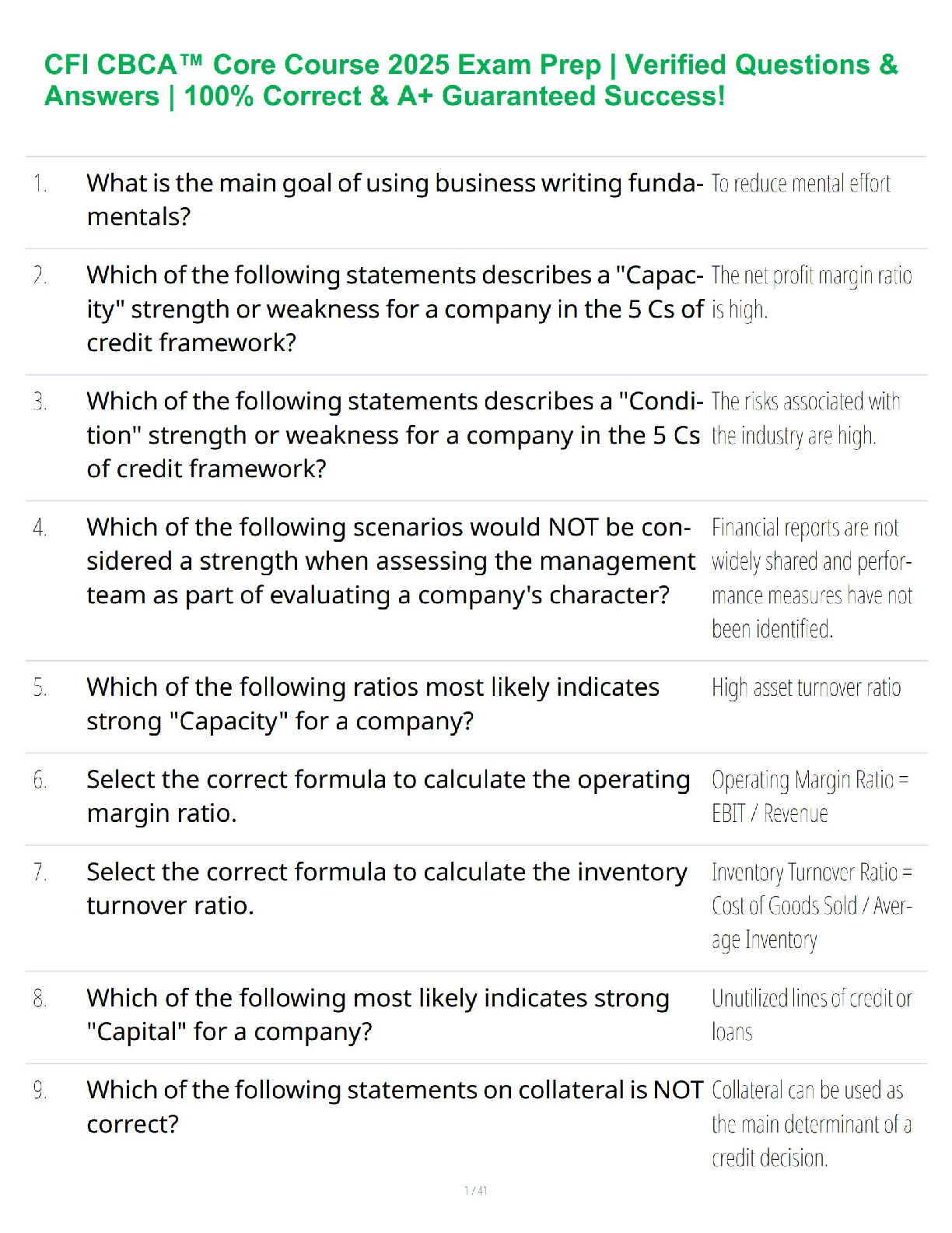 Unlock your A+ potential and ace the CFI CBCA™ Core Course exam on your very first attempt with our comprehensive 2025 Test Bank. This essential study guide, developed by the experts at the Corporate Finance Institute (CFI), provides a complete collection of verified questions and detailed, 100% correct answers. Dive deep into crucial topics like the 5 Cs of credit framework, financial ratio analysis, and business writing fundamentals. Stop worrying about resits and start studying smarter. Our proven exam prep material is your direct path to earning your Certified Banking & Credit Analyst certification with confidence.