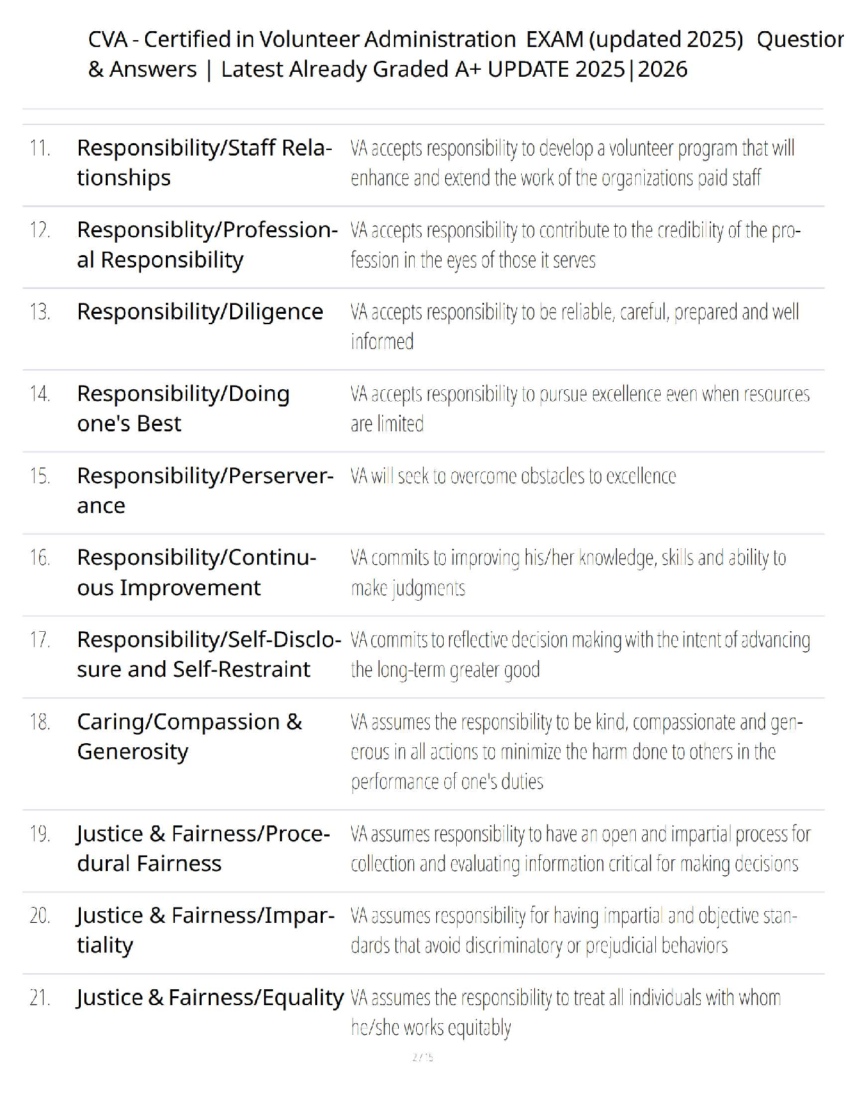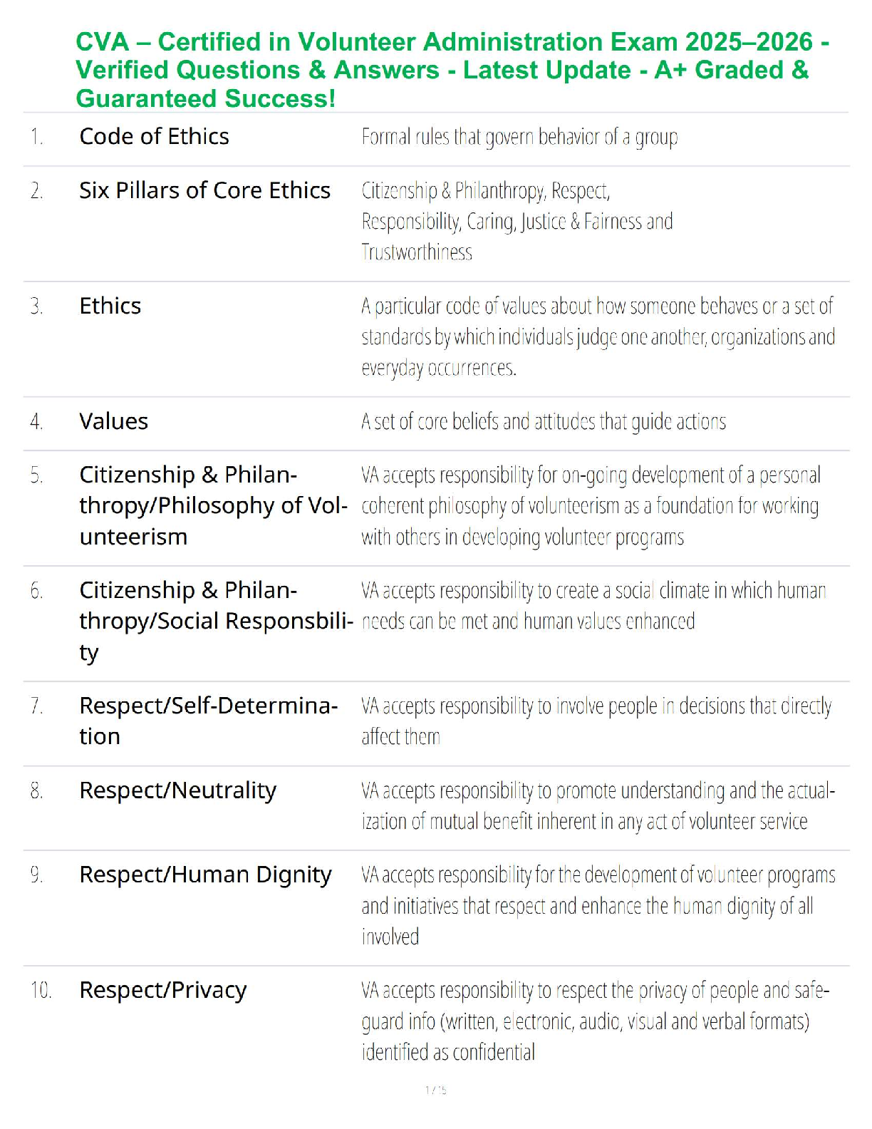 Ace your Certified in Volunteer Administration (CVA) exam on the first try with our latest 2025-2026 Test Bank. This comprehensive study guide is packed with verified questions and detailed, A+ graded answers covering all essential topics for the CVA certification. Master key concepts such as the Code of Ethics, Six Pillars of Core Ethics, values, social responsibility, and more. Designed to guarantee success and help you avoid resits, this resource provides the exact material you need to feel confident on exam day. Download now to start your journey towards CVA certification!