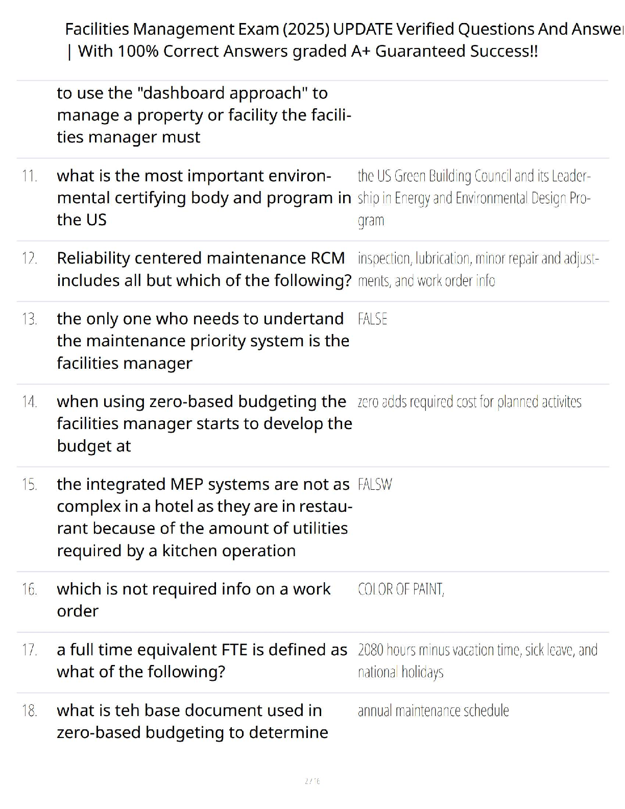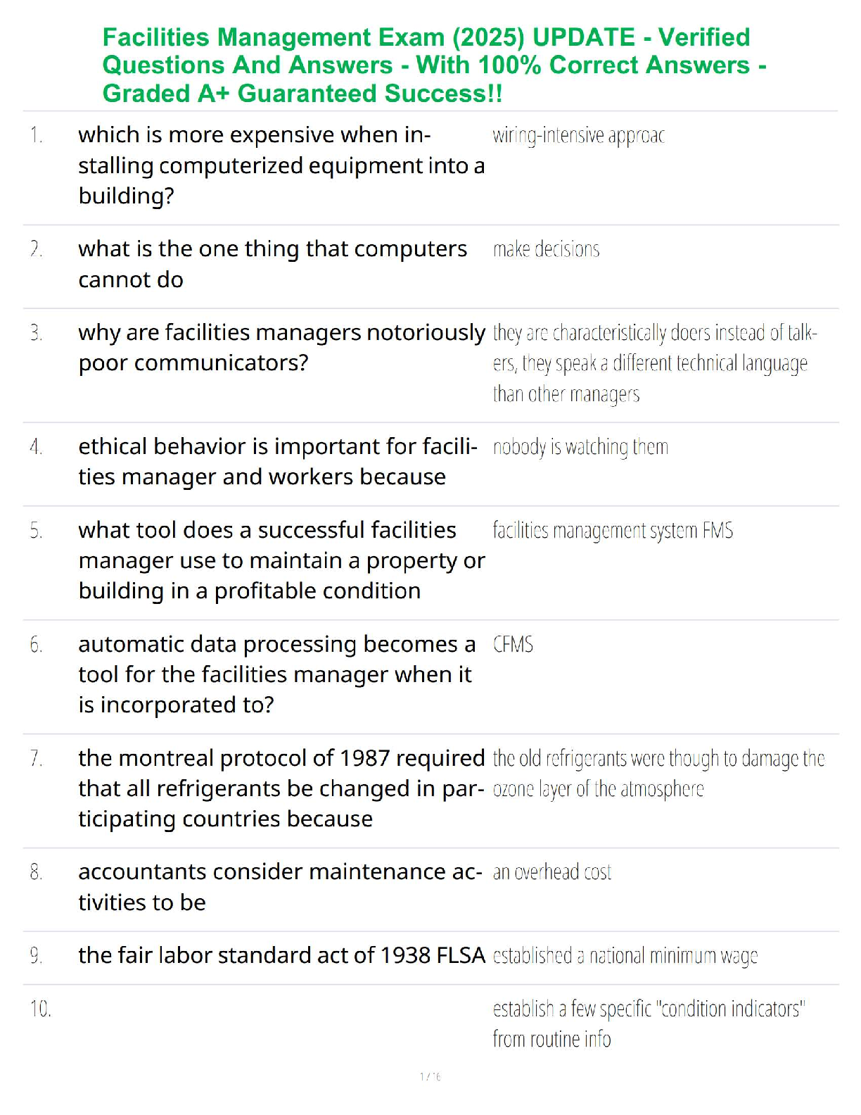Unlock guaranteed A+ success on your Facilities Management Exam with our latest 2025 updated test bank. This comprehensive resource is packed with verified questions and 100% correct, expertly reviewed answers. Don't leave your grade to chance; master key concepts from financial and labor standards to environmental protocols and modern management systems (FMS/CFMS). Our study guide is strategically designed to help you understand the material deeply, ensuring you pass your exam with flying colors on the very first try. Get immediate access to the ultimate preparation tool and secure your professional future.