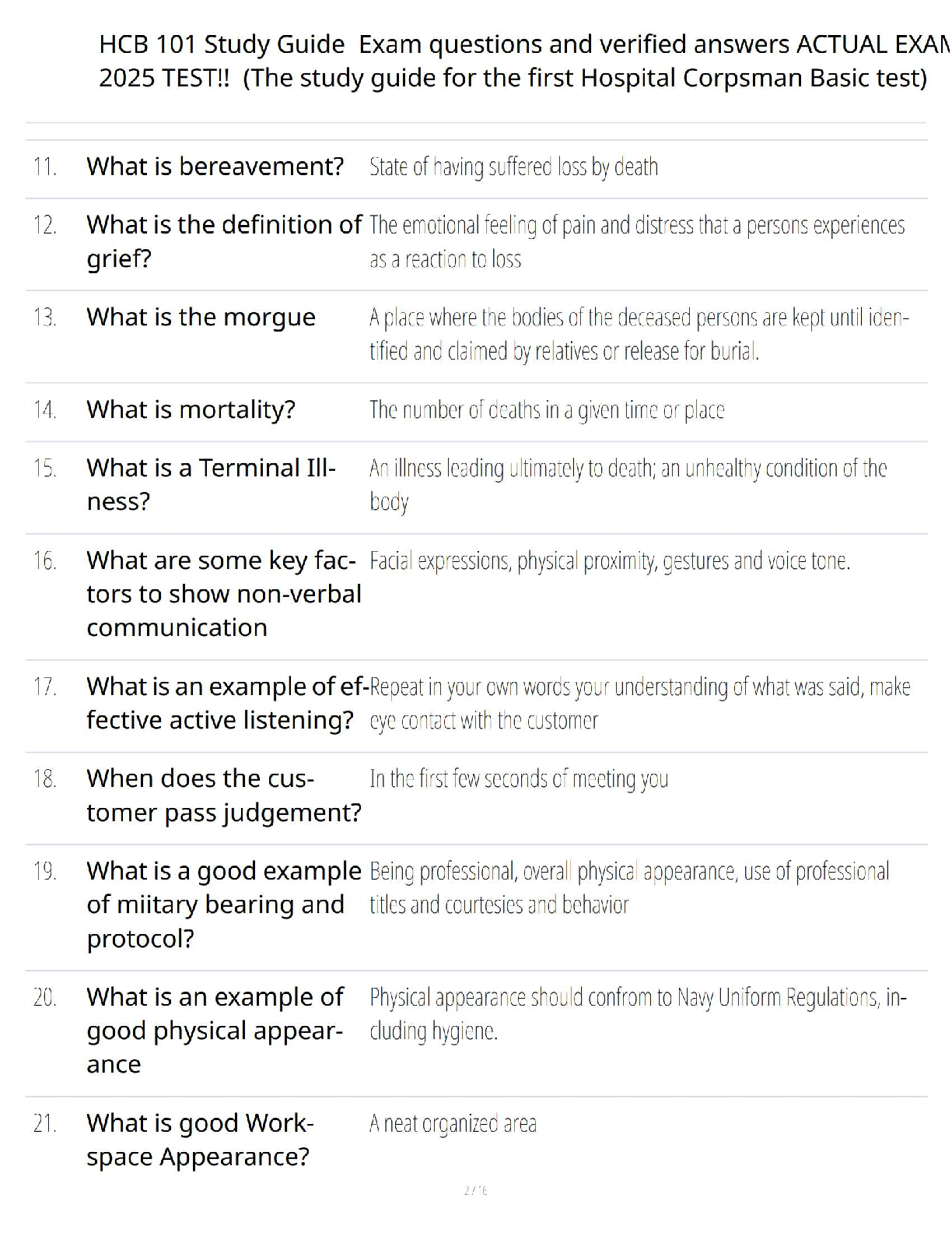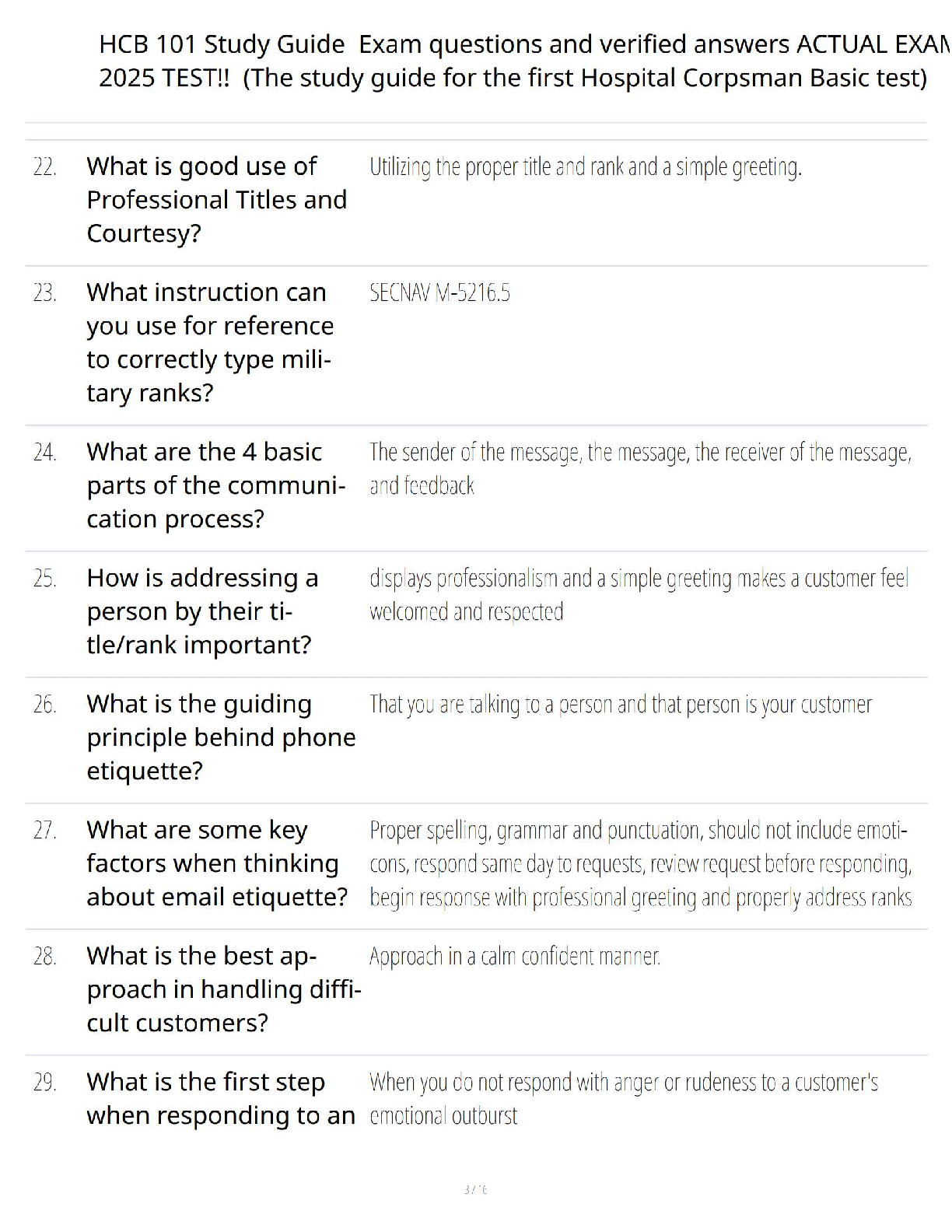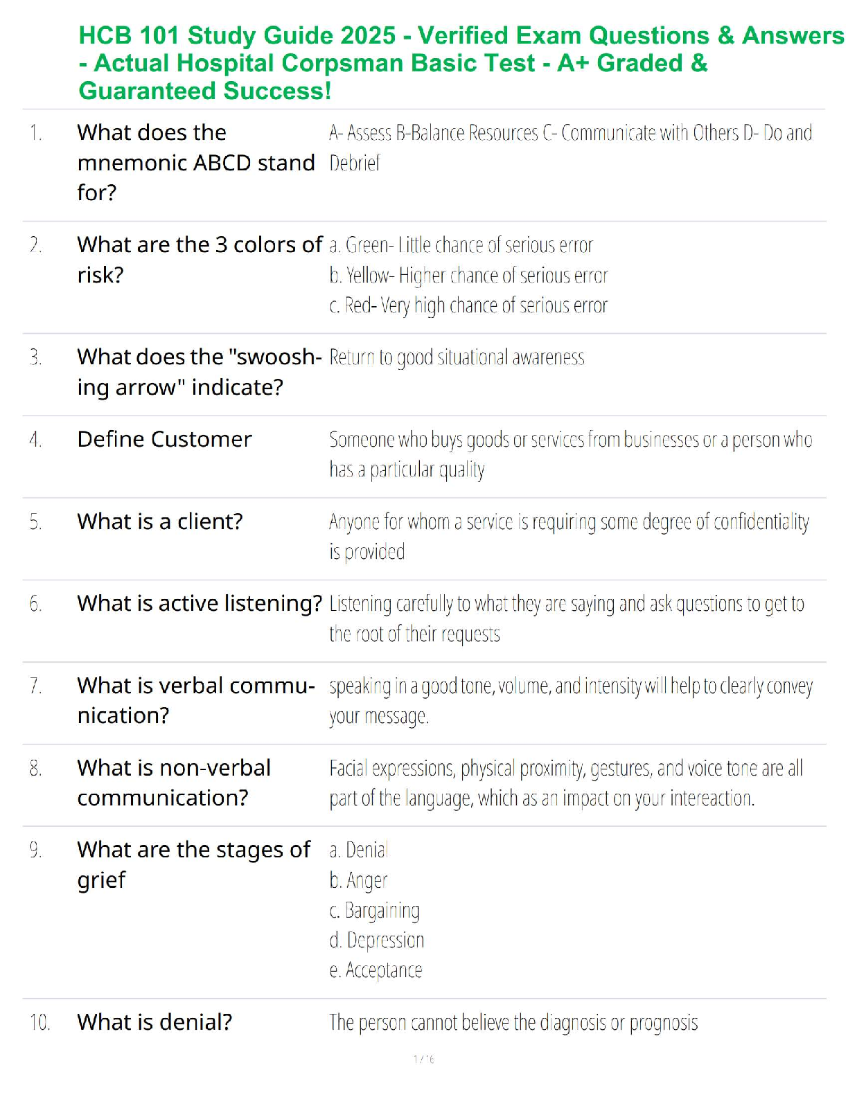 Unlock your potential and guarantee your success in the Hospital Corpsman Basic Test with our comprehensive HCB 101 study guide for the 2025/2026 academic year. This A+ graded resource is meticulously crafted with verified exam questions and detailed answers, covering all essential topics you need to master. From critical mnemonics like ABCD to understanding risk levels, communication skills, and the stages of grief, this guide provides the clarity and confidence needed to pass your exams on the very first attempt. Stop worrying about resits and start preparing for excellence with this ultimate study companion.