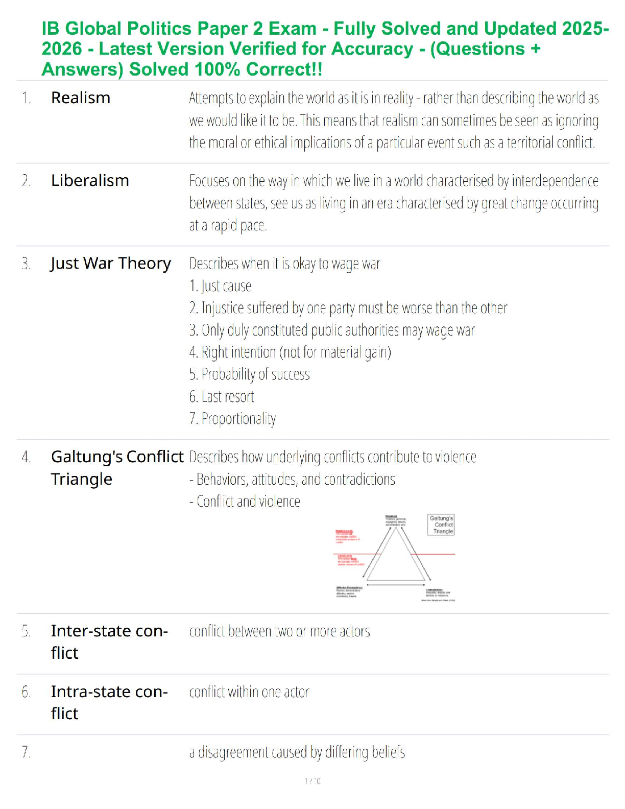 Get ready to excel in your IB Global Politics Paper 2 exam with our newly updated 2025-2026 Test Bank. This essential resource is packed with a comprehensive set of questions and meticulously verified, 100% correct answers. Dive deep into core topics such as Realism, Liberalism, Just War Theory, and Galtung's Conflict Triangle, ensuring you have a firm grasp of the concepts that will appear on your exam. This study guide is expertly crafted to streamline your revision process, boost your confidence, and help you pass on your very first attempt. Stop worrying about resits and secure the grade you deserve with this proven tool for success!