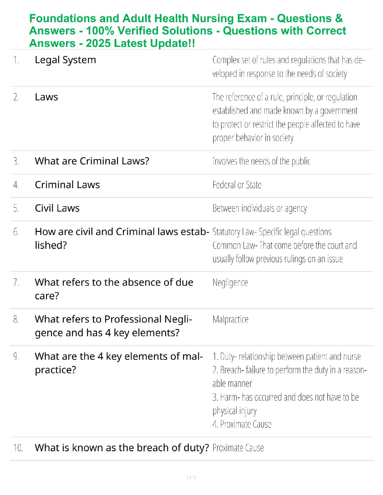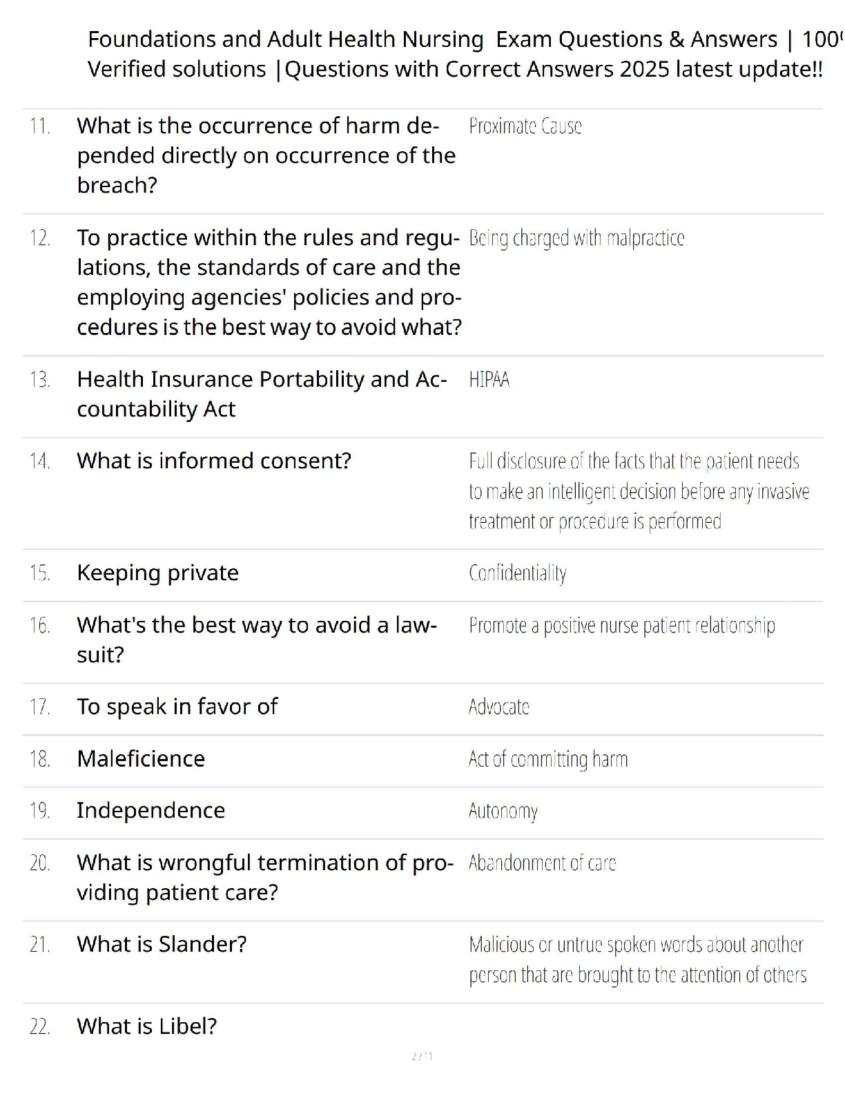 Excel in your nursing studies with the complete Test Bank for Foundations and Adult Health Nursing, 3rd Edition by Cooper and Gosnell. This essential study guide, updated for 2025, features an extensive collection of questions with 100% accurate, verified answers. It specifically covers critical legal concepts in nursing, including criminal vs. civil law, professional negligence, and the four key elements of malpractice. This resource is expertly crafted to help you understand difficult topics, prepare effectively, and pass your exams with confidence on the first attempt.