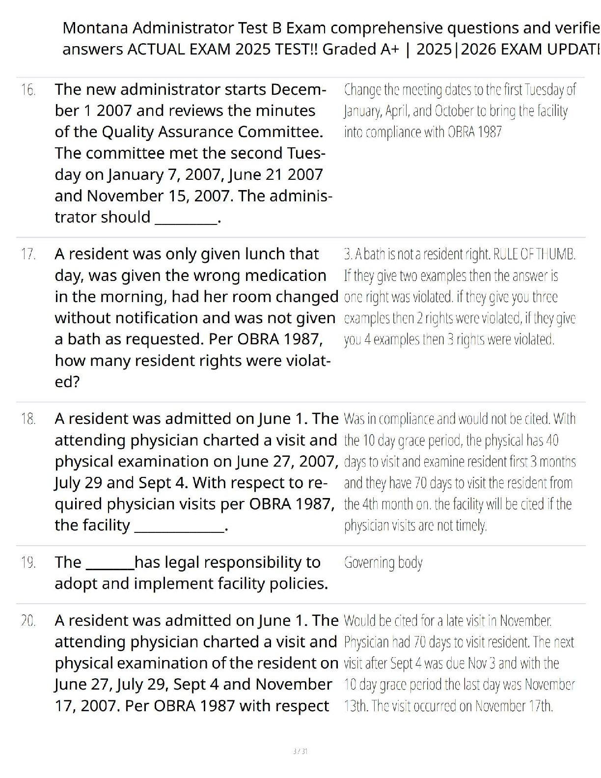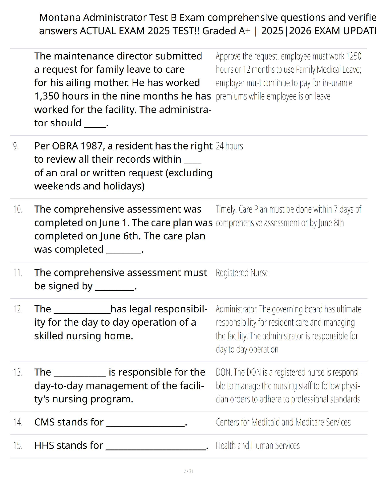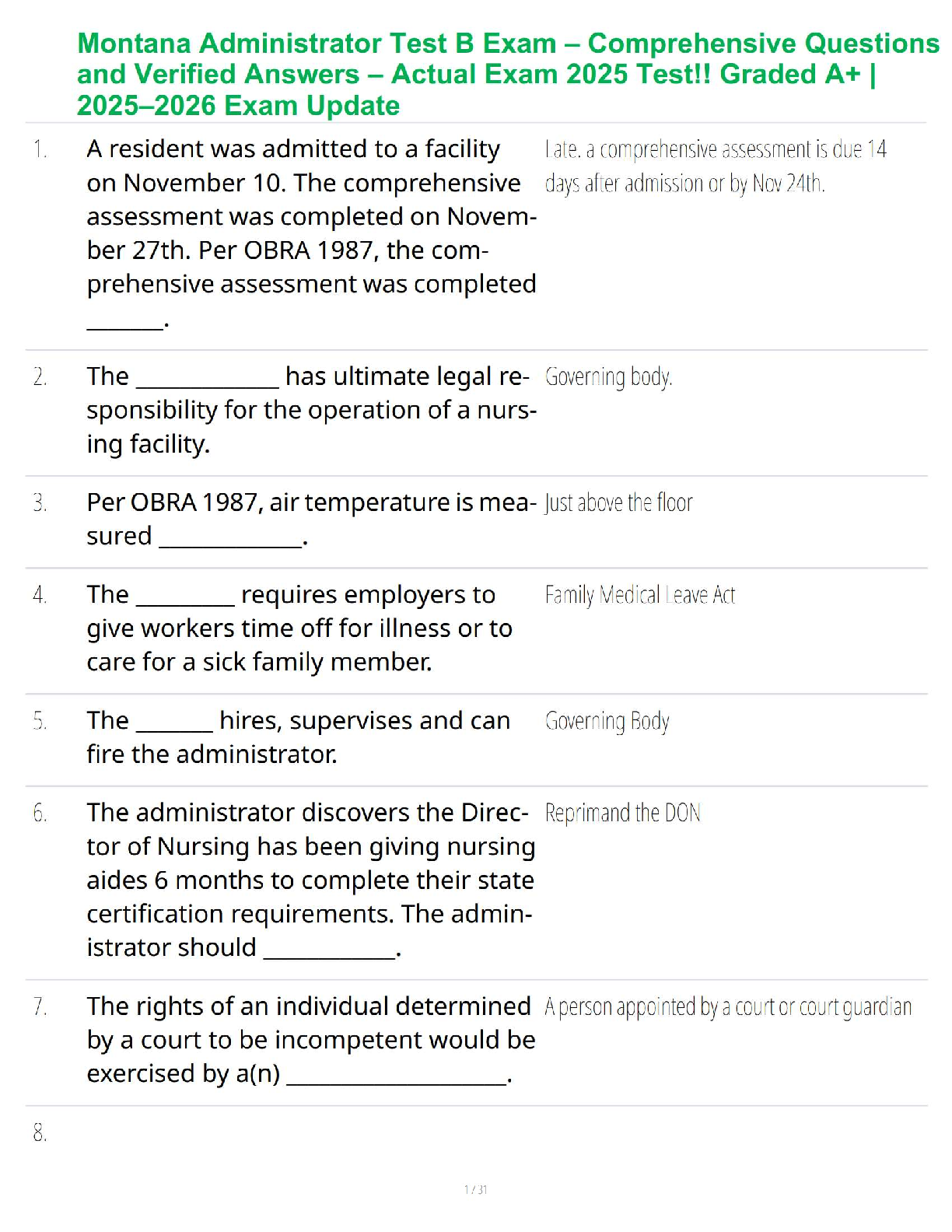 Get fully prepared for your Montana Administrator Test B Exam with our latest 2025/2026 study guide. This comprehensive test bank features a complete set of actual exam questions paired with 100% correct, verified answers. Master key topics such as OBRA 1987 regulations, legal responsibilities like the Family Medical Leave Act, and the day-to-day operational duties of a nursing facility administrator. This A+ graded resource is expertly designed to help you understand the material thoroughly, boost your confidence, and pass your certification exam on the very first attempt. Avoid resits and fast-track your career with this essential study tool.